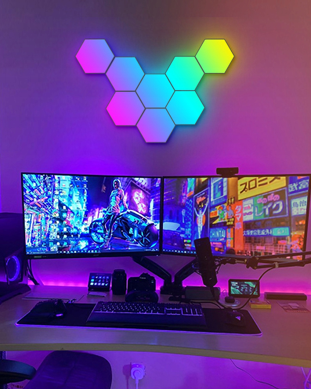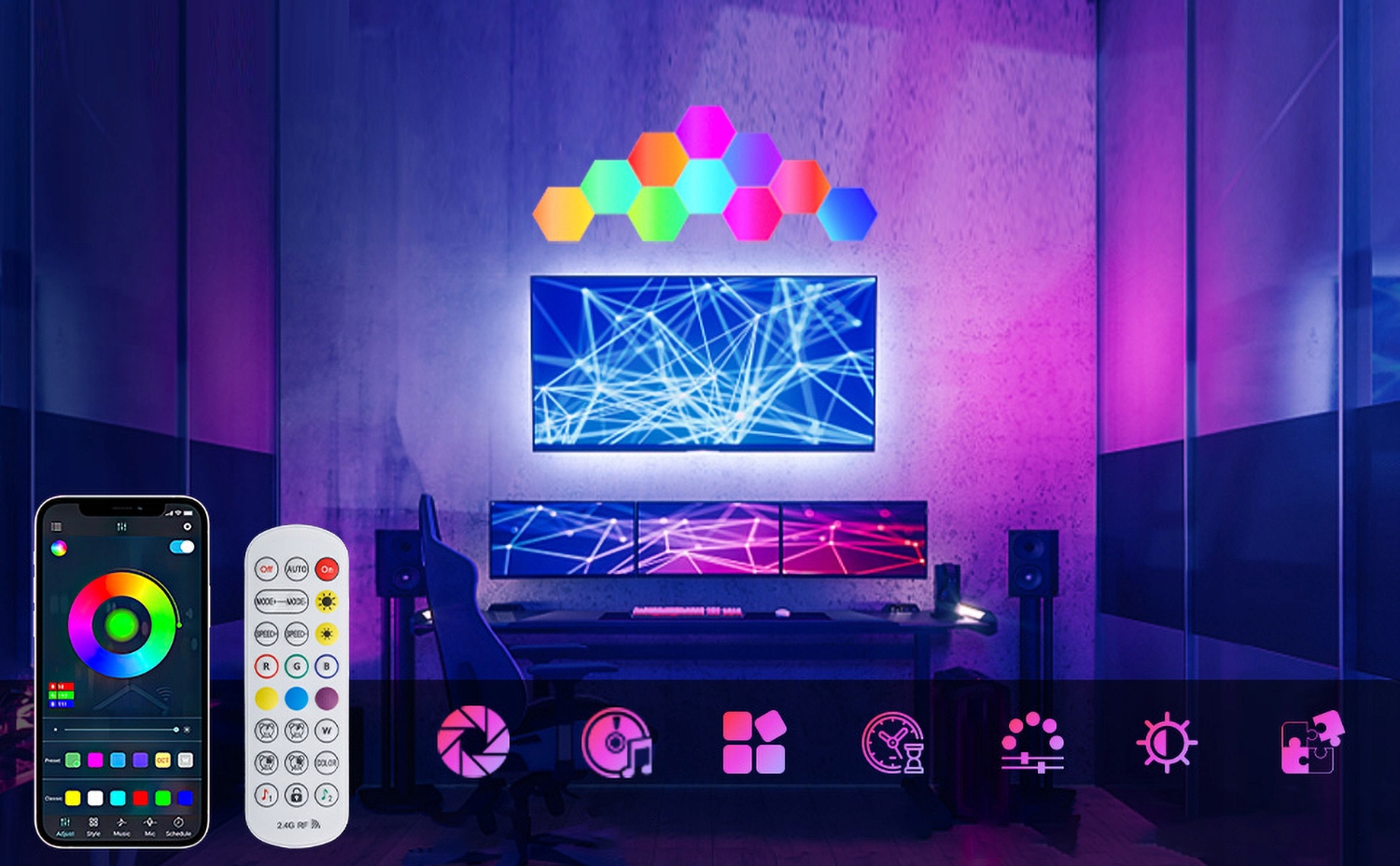 Шестиугольные настенные светильники создают идеальную атмосферу при просмотре фильмов или игр с помощью простых голосовых команд через Alexa или Google Assistant. Создавать настроение для встреч в пятницу вечером стало проще, чем когда-либо. Наши шестиугольные световые панели созданы для тех, кто мыслит нестандартно, когда дело касается освещения. Наслаждайтесь технологиями умного дома и сделайте свою жизнь умнее. Системы Alexa Light позволяют вам наслаждаться невероятной динамикой без помощи рук. (только 2.4)