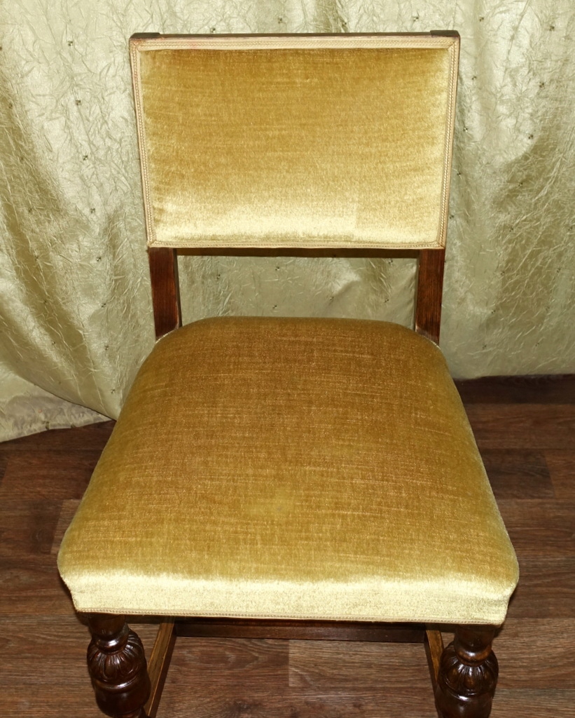 Стильные банкетные стулья к столу. Б/у мебель из дуба около 50-60 лет назад. Дерево цвета рустикального дуба, обивка из плюша медового и оливкового оттенка. Состояние стульев хорошее (только на одном из стульев есть небольшие загрязнения на задней части спинки, видно на последнем фото).