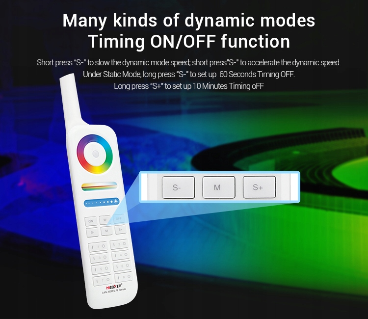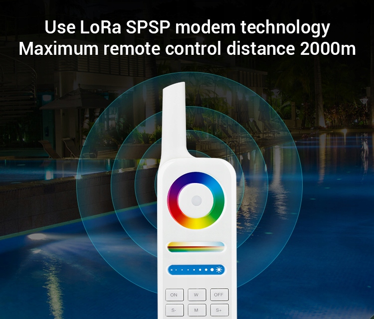 8-зонный пульт FUT086, работающий на частоте 433 МГц, предназначенный для управления внешними светильниками. Позволяет менять цвет, насыщенность света и яркость назначенных устройств. Связь между пультом дистанционного управления и передатчиком осуществляется по радиоканалу на основе технологии Long Range (LoRa). Сигнал на частоте 433МГц обеспечивает беспроводную работу установки на высоте 2000 метров и до 50 метров при погружении в воду. глубина 0,5 м.