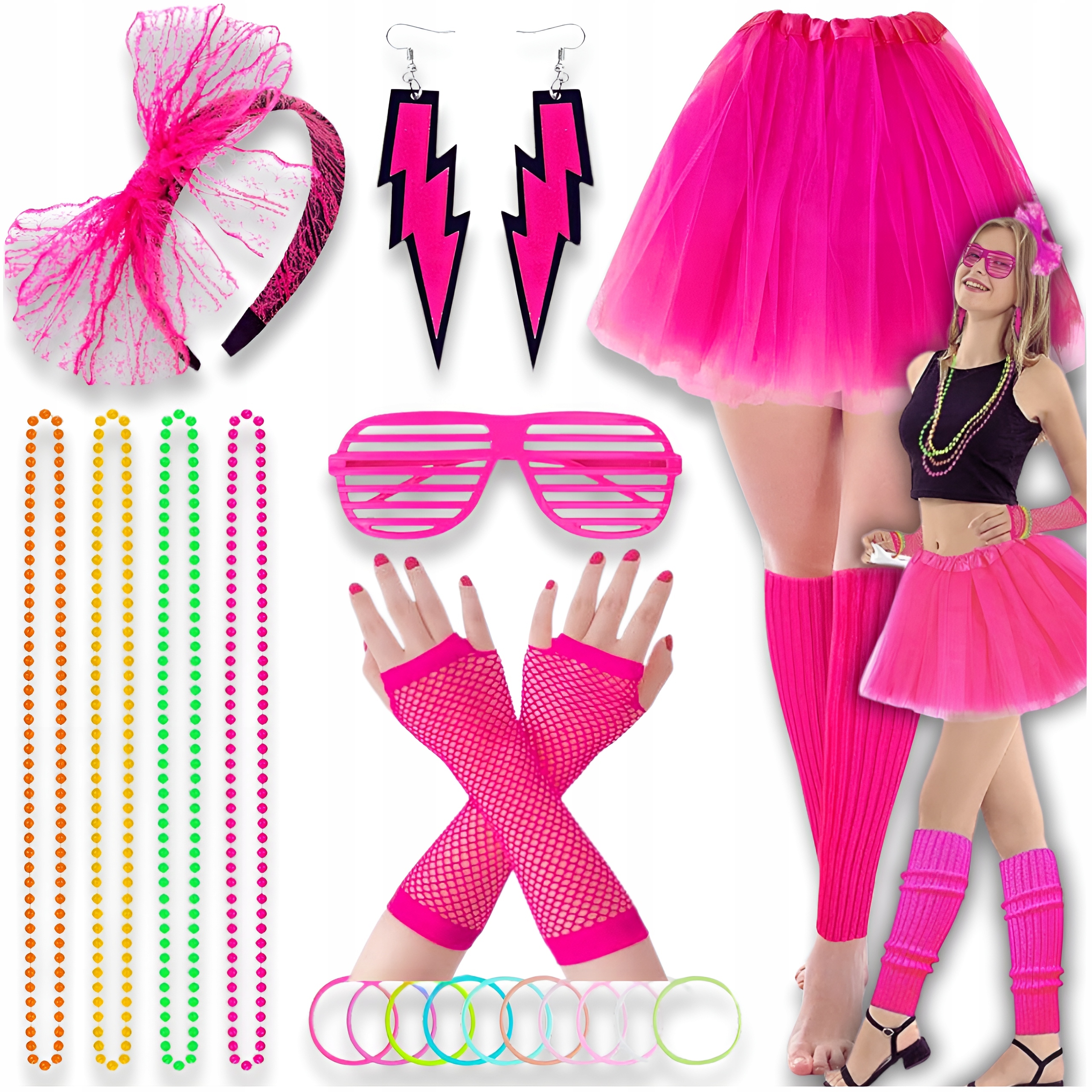 Юбка + футболка + повязка на голову + перчатки + гетры + серьги + 10 браслетов + 4 ожерелья + очки