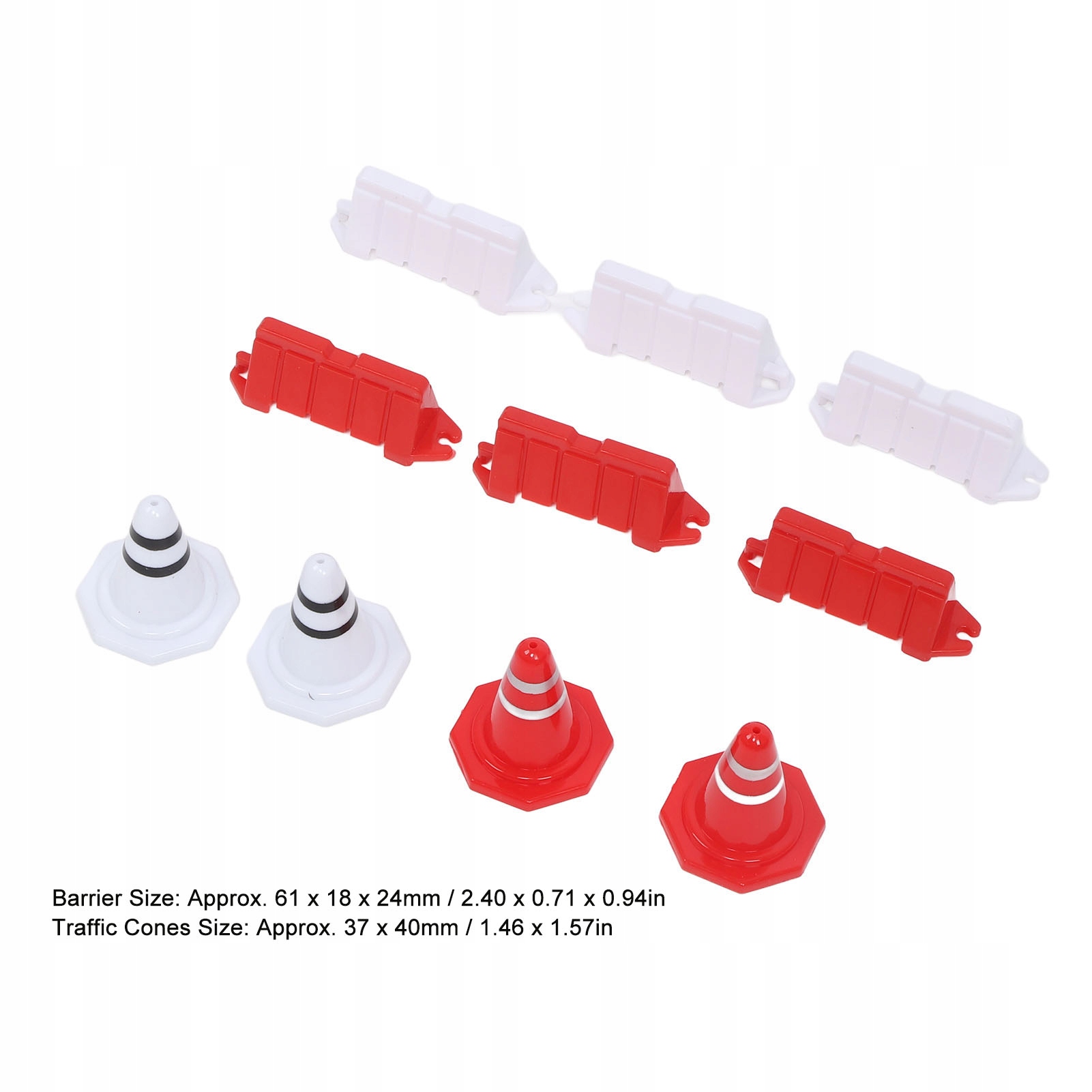 Вес: прибл. 215 г / 7,6 унций Цвет барьера: белый, красный (по 40 шт.) Цвет дорожных конусов: белый, красный (по 5 шт.) Размер барьера: прибл. 61 х 18 х 24 мм / 2,40 х 0,71 х 0,94 дюйма. Размер дорожного конуса: прибл. 37 х 40 мм / 1,46 х 1,57 дюйма.