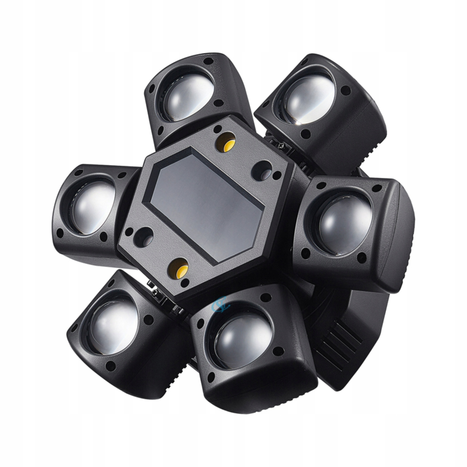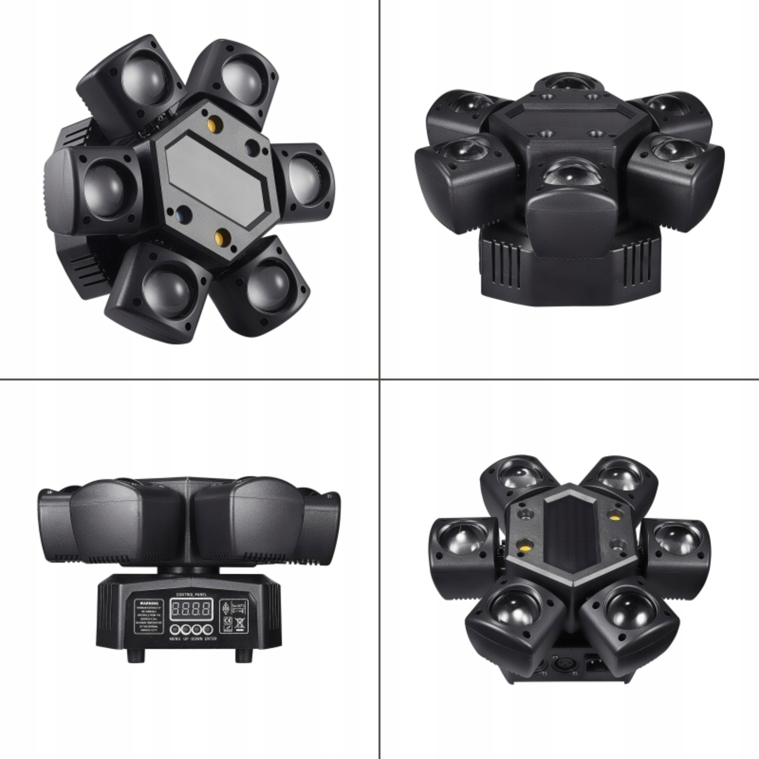 Лучи + лазеры + узоры — все они питаются от 12 светодиодов мощностью 3 Вт, 53 светодиодов RGB и красных/зеленых лазеров. Кроме того, янтарно-белый стробоскоп для более насыщенного эффекта.