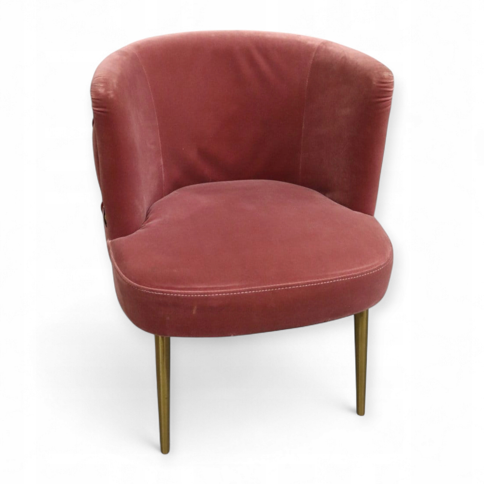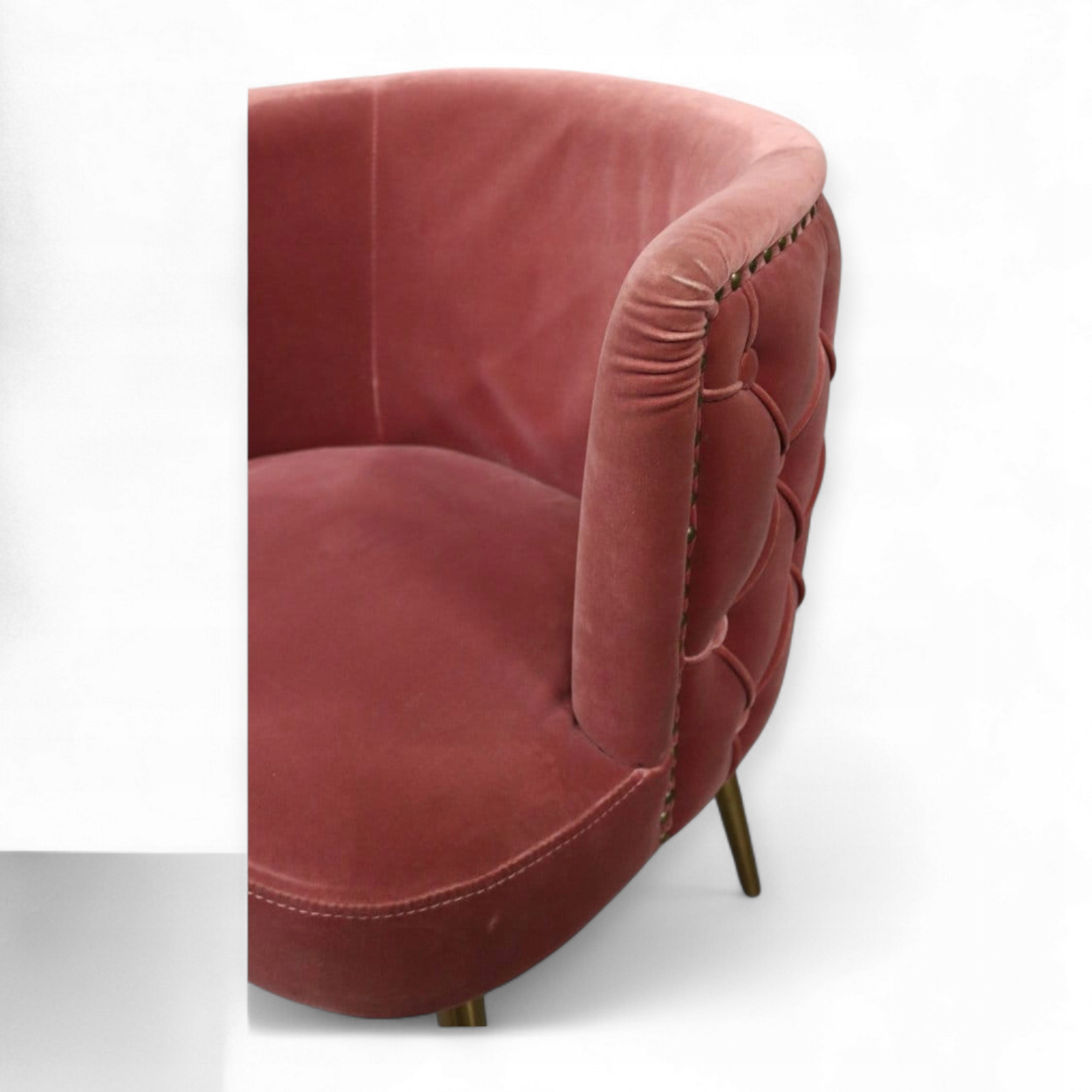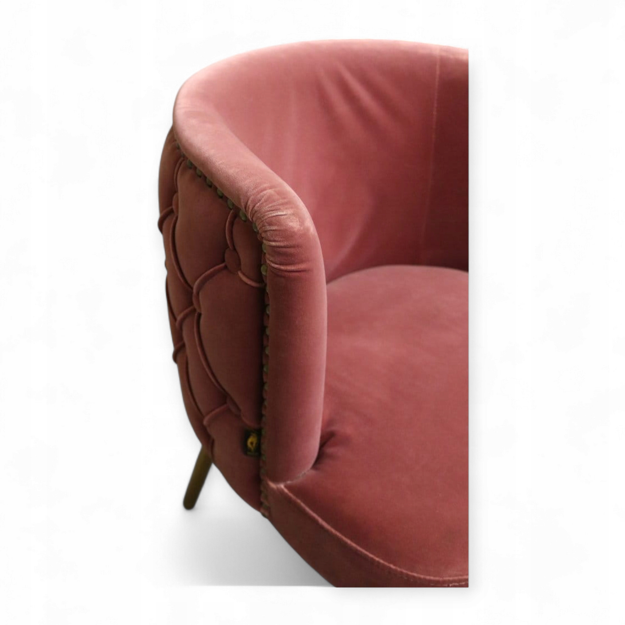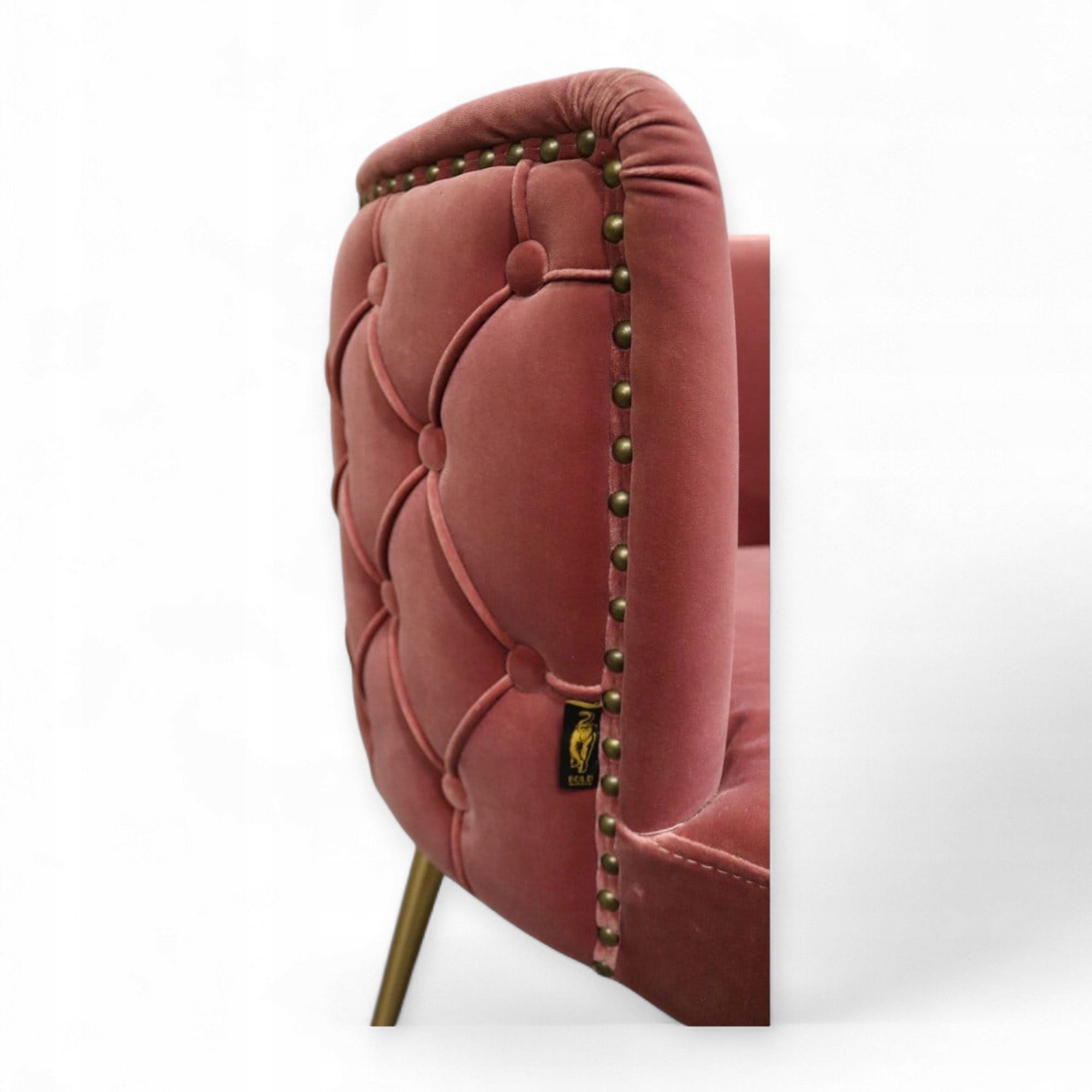 Обивка выполнена из бархатной, приятной на ощупь ткани модного розового оттенка. Стеганая спинка, отделанная стильными заклепками, подчеркивает роскошный характер кресла. Все это дополняется тонкими ножками из матовой латуни, которые добавляют легкости и элегантности.