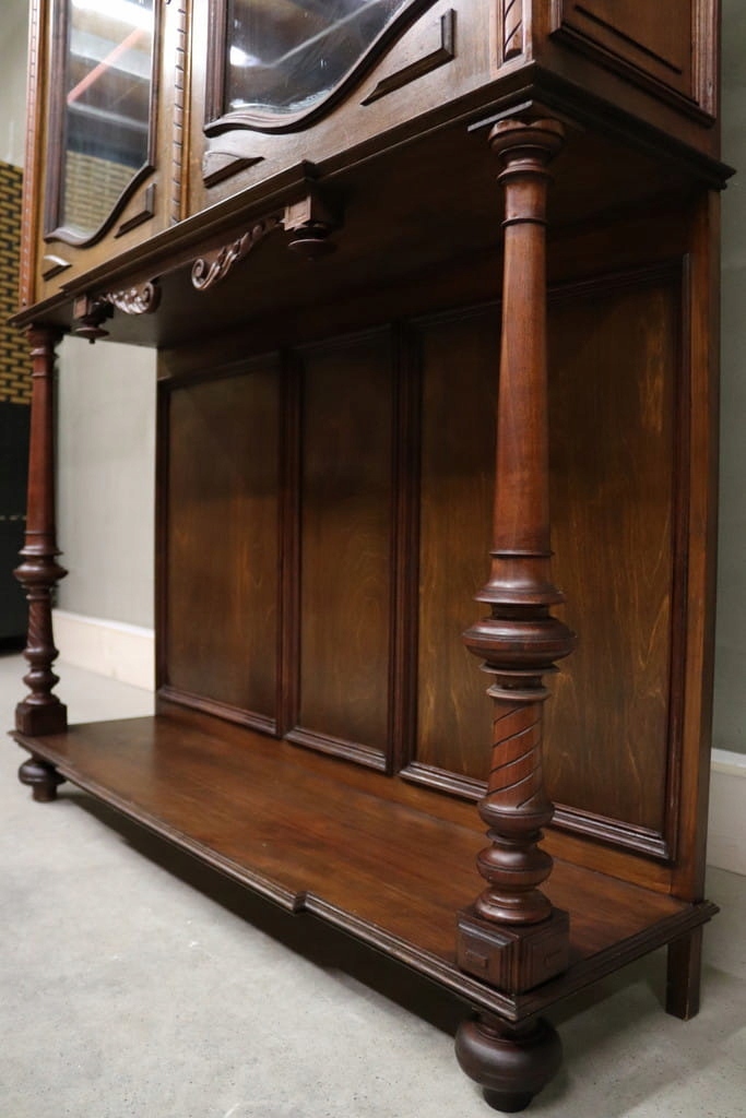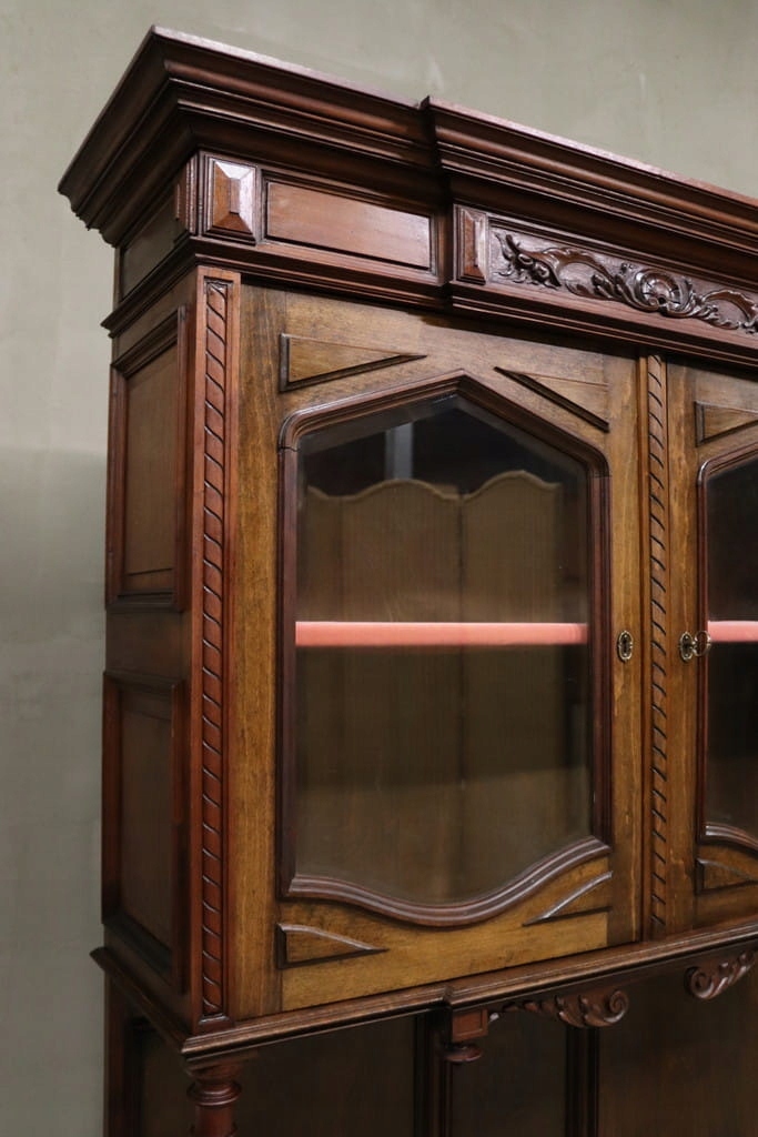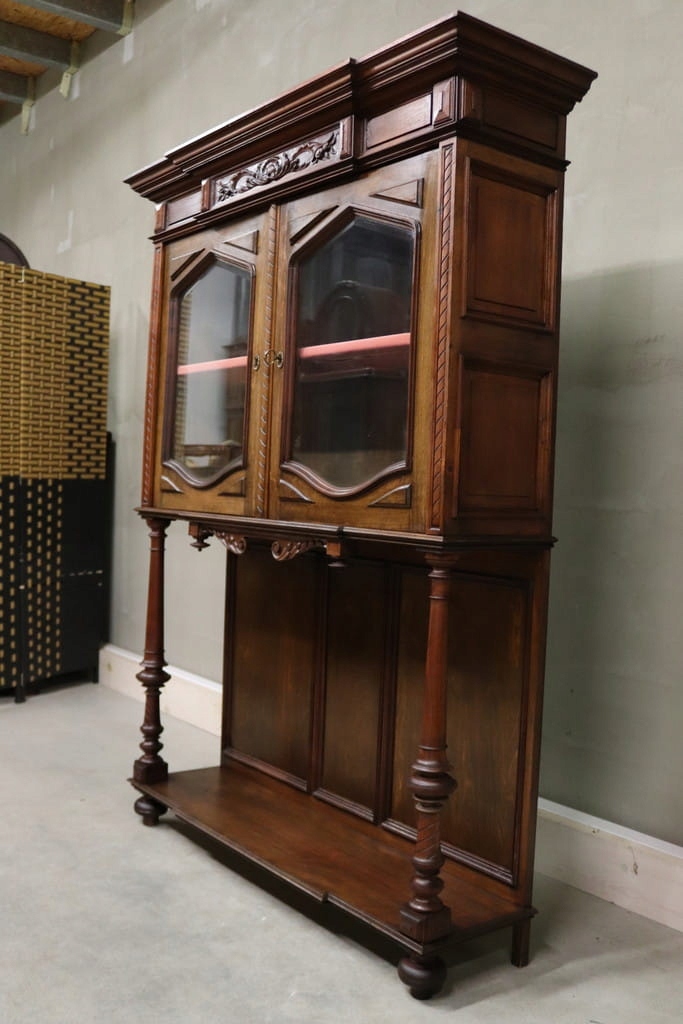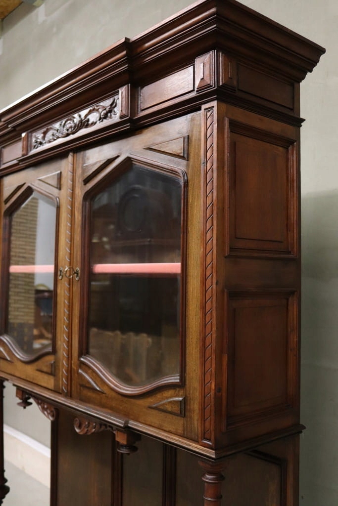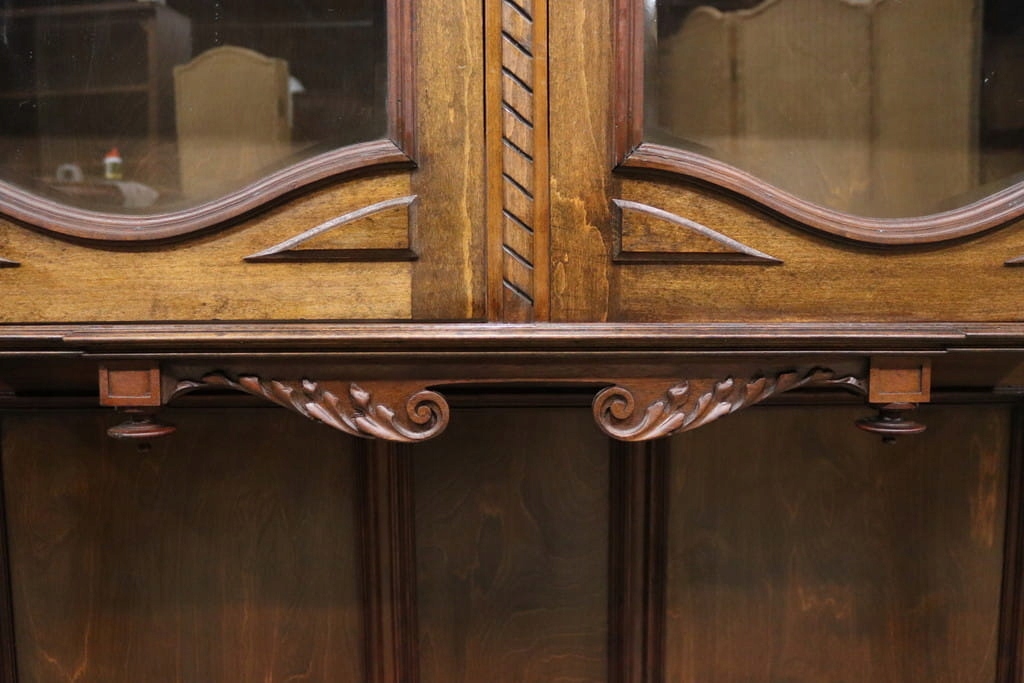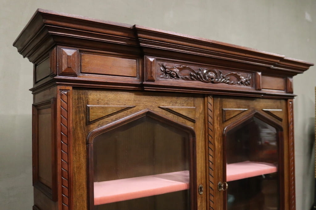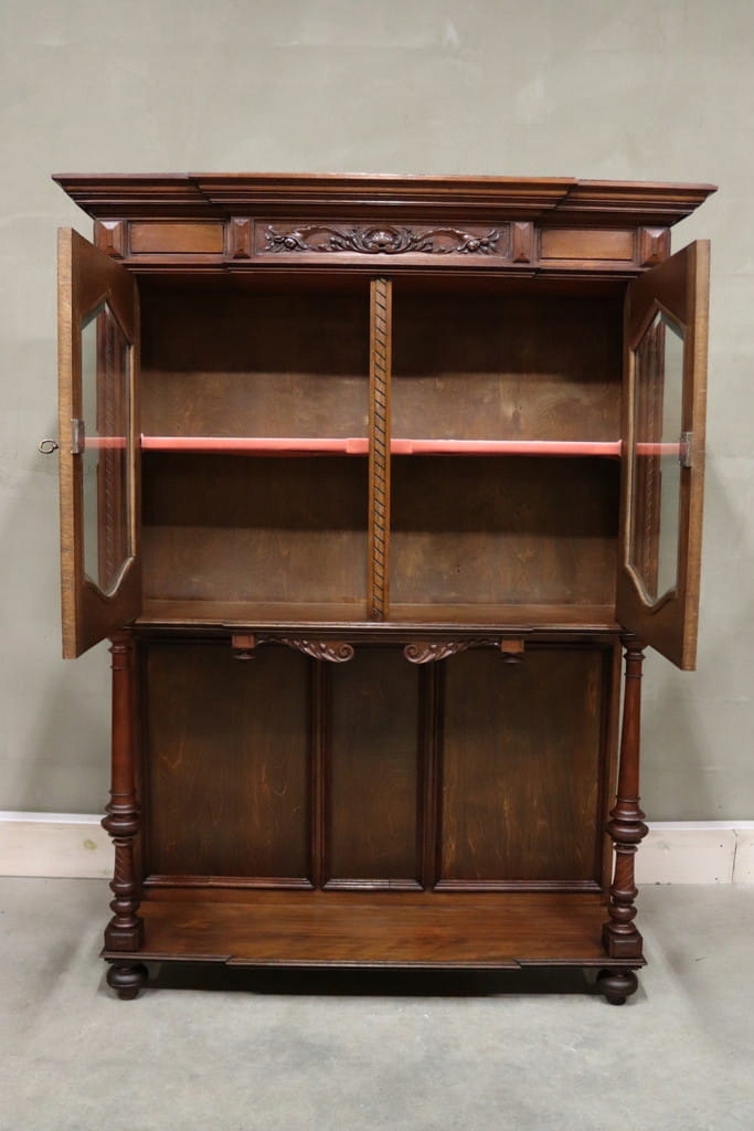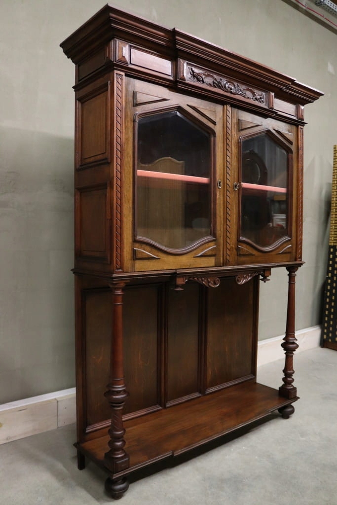 Состояние на фотографиях — незначительные следы использования — скошенное стекло — витрина без повреждений — следы древесных червей на задней панели.