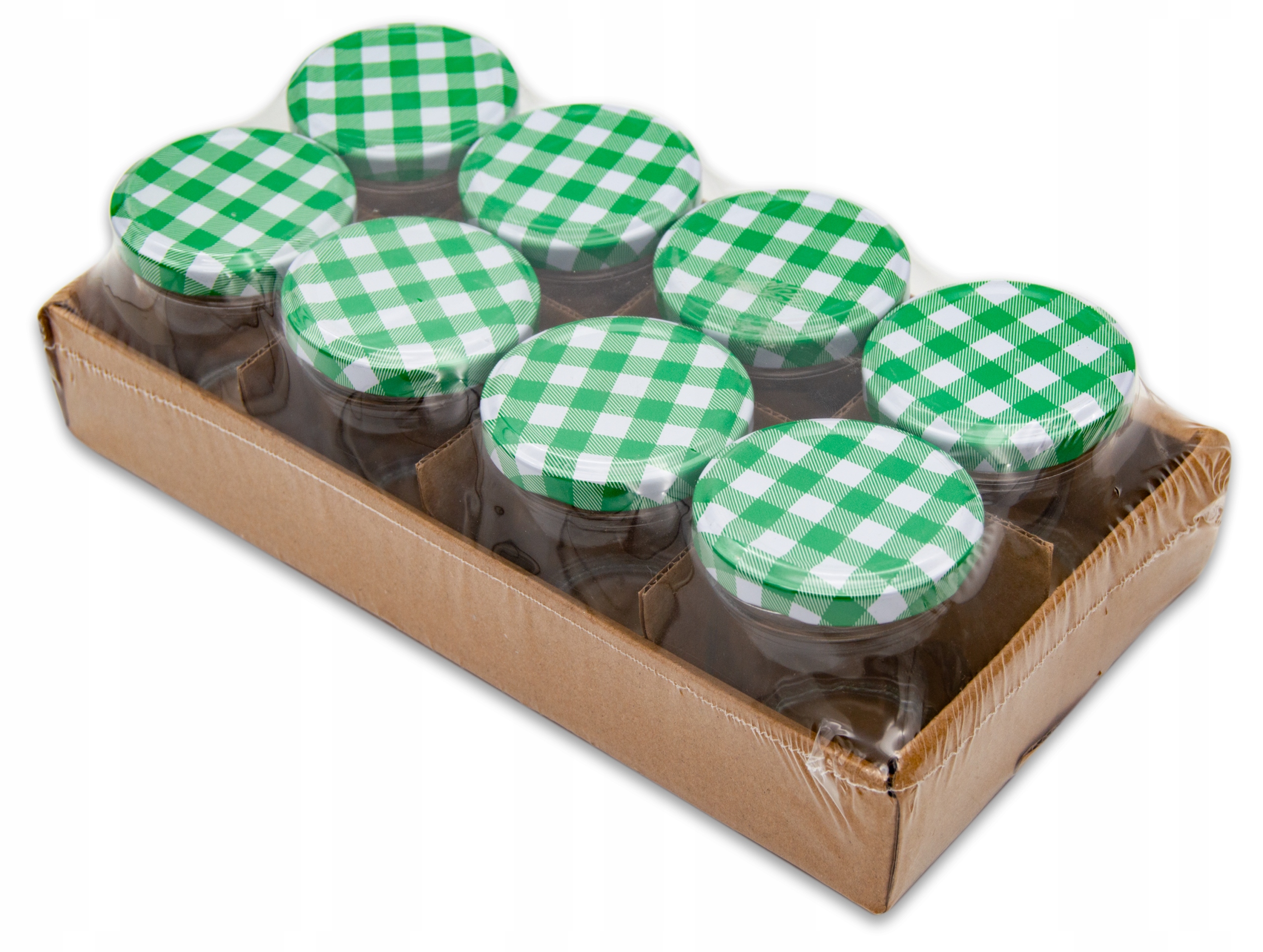 Набор из 8 баночек упакован в картонную коробку! Крышки в наборе одинаковые, одного цвета.