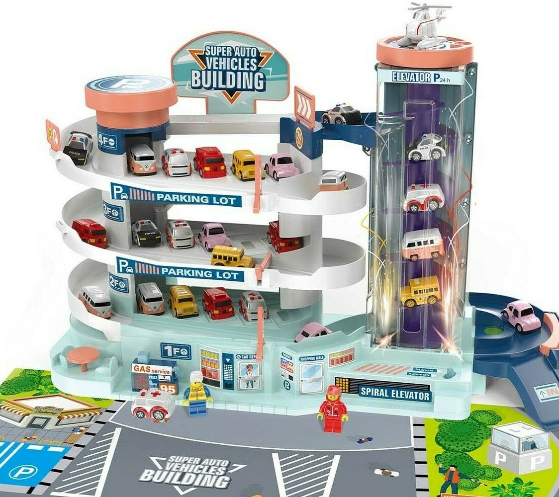 Большой многоуровневый паркинг и гаражи с заправкой, электрическим лифтом и посадочной площадкой для вертолета – набор, который доставит радость каждому маленькому ребенку! Парковка адаптирована для «спрингеров» и содержит множество дополнительных элементов, которые значительно разнообразят веселье, таких как наклейки, выезды, проезды и фольгированный коврик с городком, который можно разместить в качестве декора под нашей парковкой.