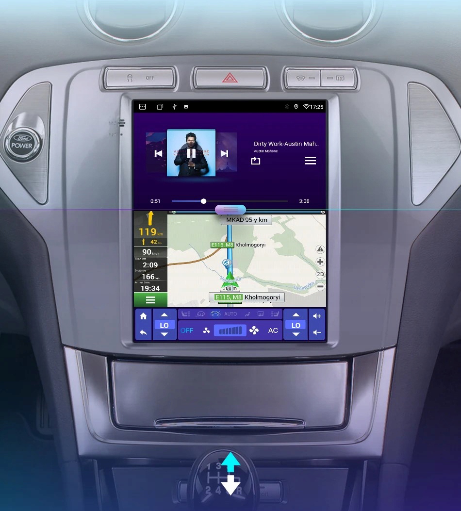 Вы можете использовать 2 приложения одновременно (например: навигация + музыка, камера ADAS + музыка и т. Д.)