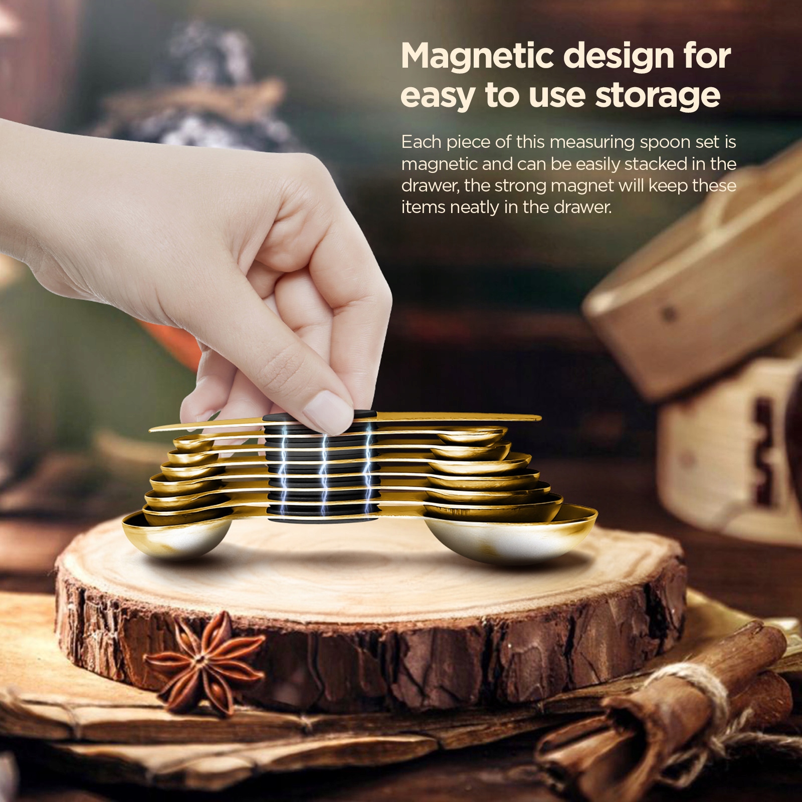 Почувствуйте удовольствие приготовлению и выпечке благодаря этому набору высококачественных мер из нержавеющей стали! Двойные ложки идеально подходят для специй и жидкостей и всегда придерживаются магнитных ручек.