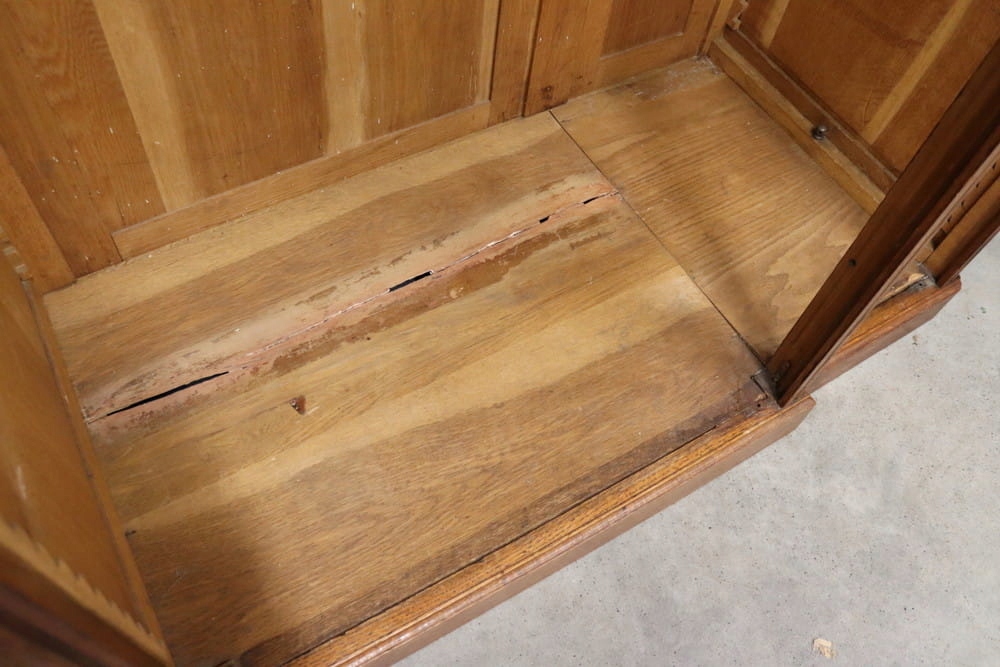 Состояние представлено на фотографиях - есть следы использования - в первоначальном состоянии, пол внутри имеет видимую щель, полки в правой части шкафа отсутствуют.