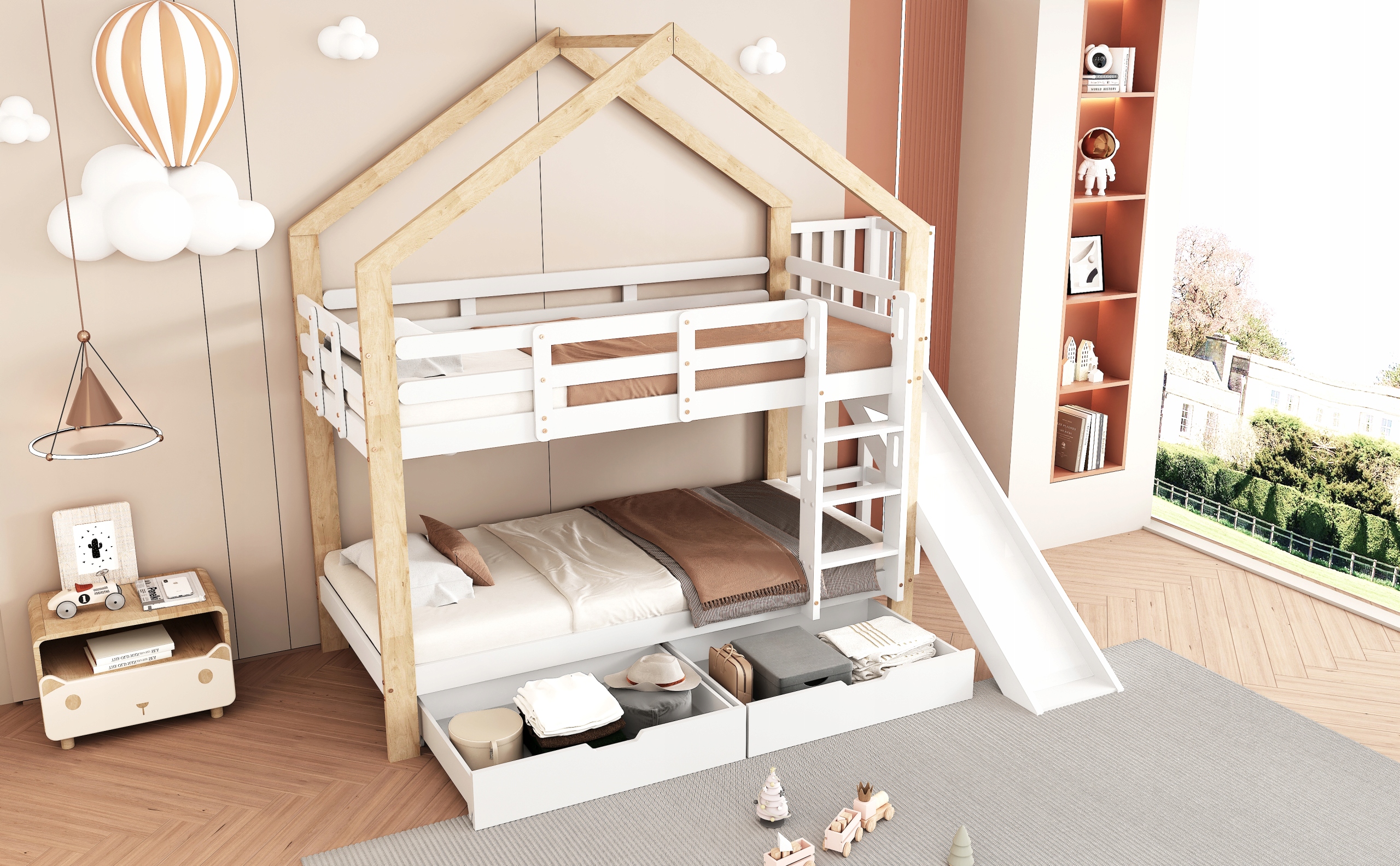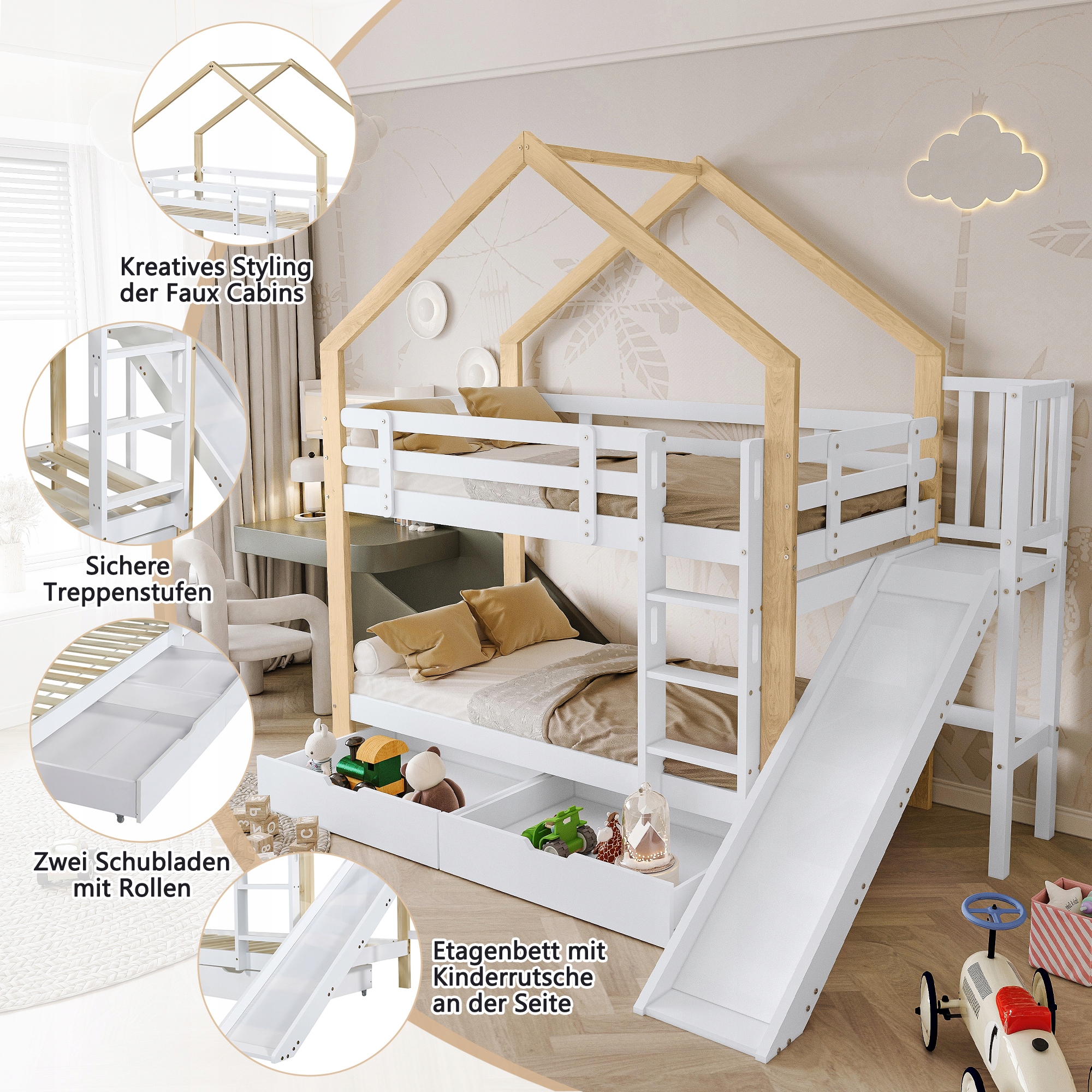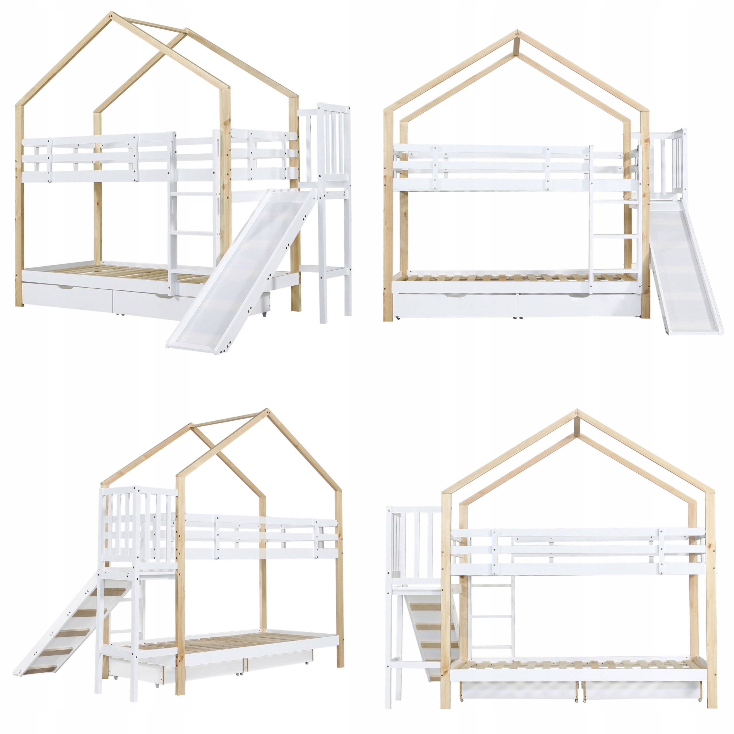 двухъярусная кровать со слайдом и трехэтажной угловой лестницей, кровать дома с защитным барьером и 2 ящиками, рама сплошного деревянного слоя, белый + натуральный, 90x200 см.