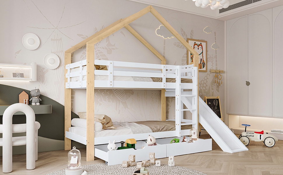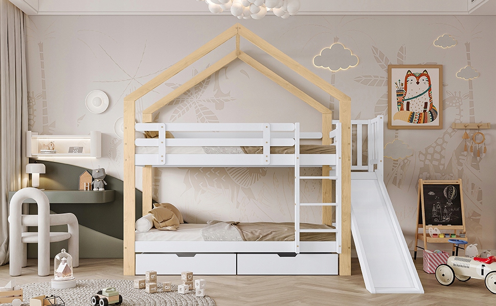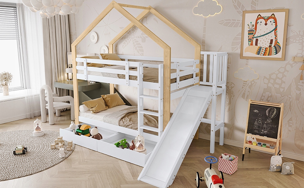 - Это двухъярусная кровать со слайдом, ящиками и барьерами предоставляет детям безопасное и приятное место для сна, стимулируя воображение и радость веселья. Это решение щадит место, которое не только практично, но и превращает детскую комнату в мир веселья.