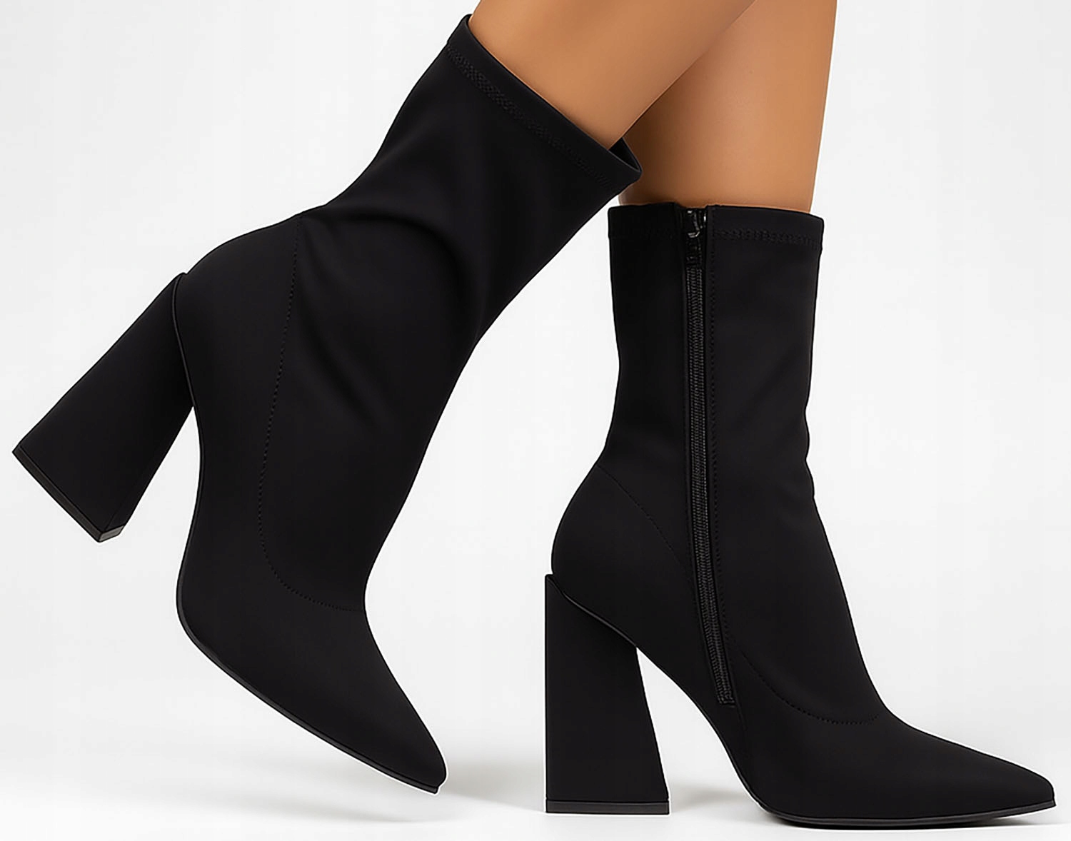 9100 ЧЕРНЫЕ ЖЕНСКИЕ БОТИНКИ НА ВЫСОКОМ КАБЛУКЕ, ЭЛАСТИЧНЫЙ МАТЕРИАЛ, МОЛНИЯ 37