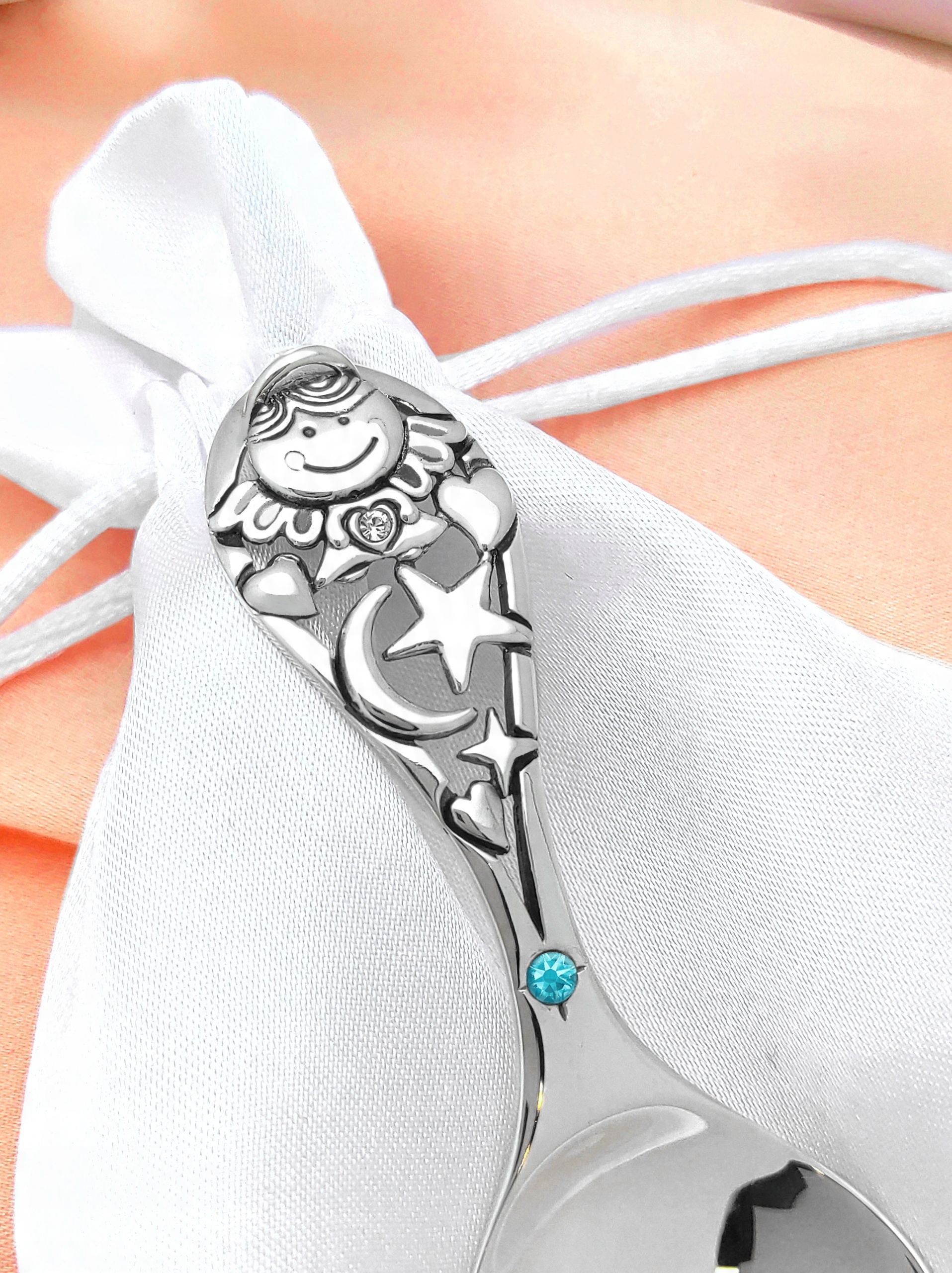 ✅Ложка HAPPY ANGEL выполнена в обоих вариантах для девочки (с розовым кристаллом) и для мальчика (с синим кристаллом) на у ангела есть небольшой циркон (хрусталь) p>