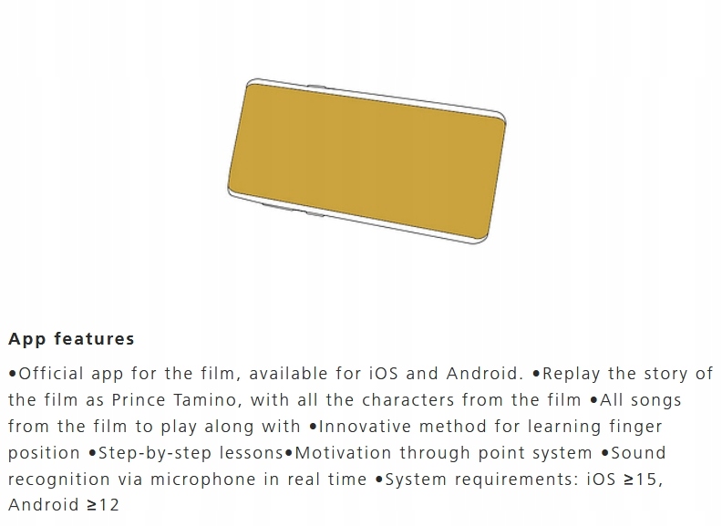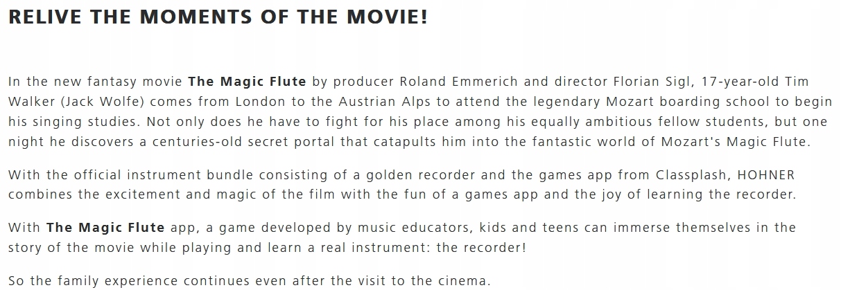 Благодаря официальному пакету, состоящему из приложения Golden Stright Flute и ClassSplash Games, Хонер сочетает эмоции и магию фильма с весельем, связанным с игровым приложением и радостью обучения, чтобы играть в простую флейту. Благодаря приложению «Волшебная флейта» - игру, разработанную музыкальными педагогами - дети и молодые люди могут погрузиться в историю фильма и научиться играть на настоящем инструменте: прямая флейта!