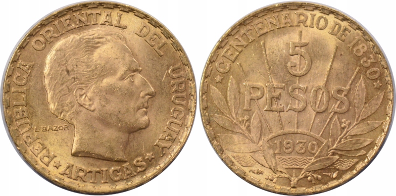 989z. Уругвай 5 песо 1930 Стэн и золото