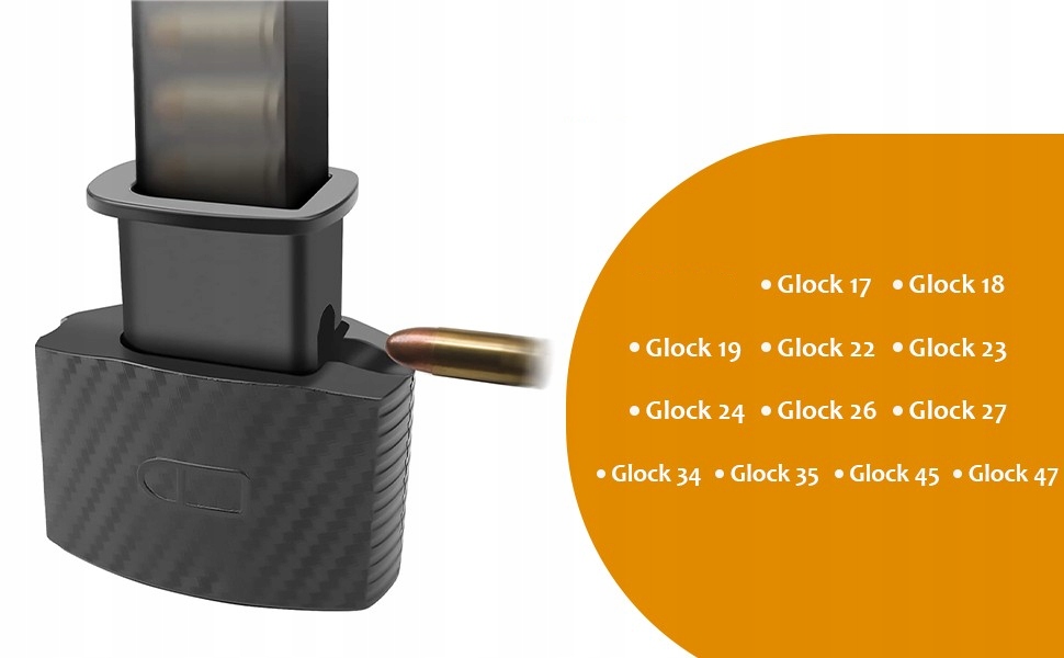 - 9mm/.40 Glock 17, 18, 19, 22, 23, 24, 26, 27, 34, 35, 45 и 47