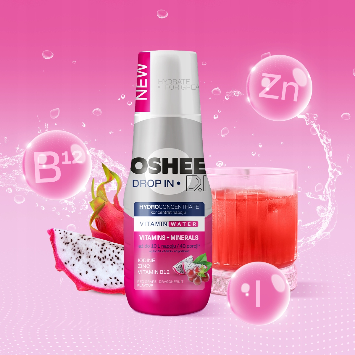 oshee drop in hydrokonconcentrat со вкусом красного винограда и дракона - это не только функциональность, но и удовольствие для чувств. Без искусственных ароматов, красителей и сиропа глюкозы-фруктозы. Идеальное сочетание обновления с оттенком экзотической - тонкой, но запоминающейся.