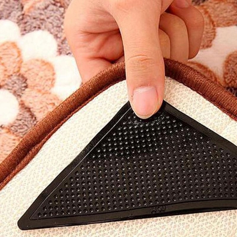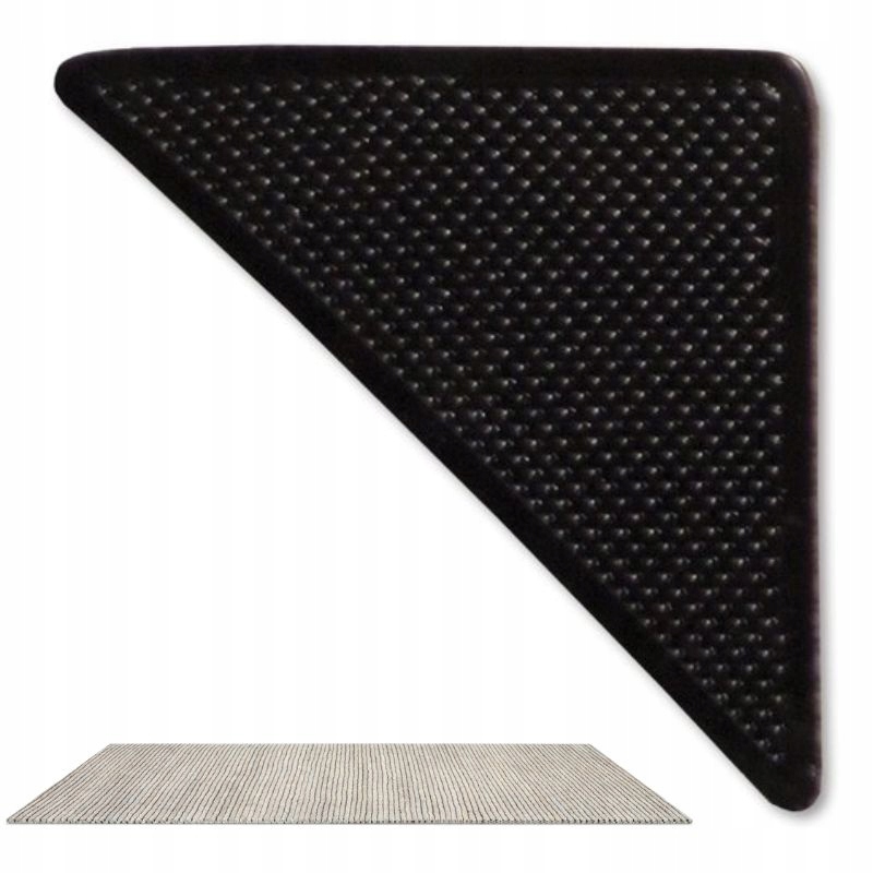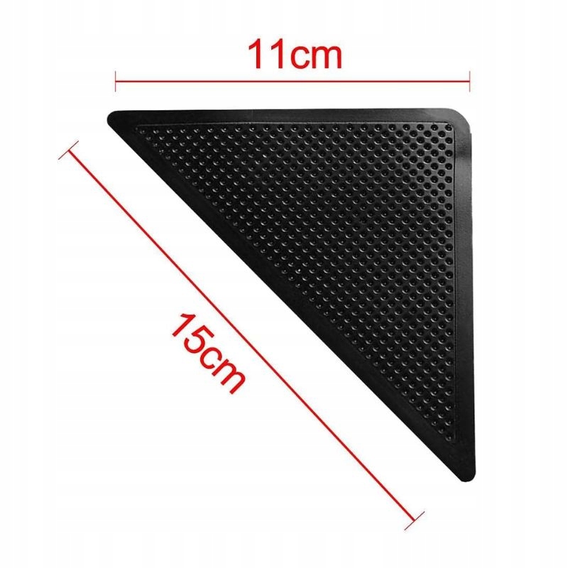 Подушечки изготовлены из гибкого, но прочного резинового материала, который идеально прилегает к полу и удерживает ковер на месте. Их **треугольная форма** идеально подходит к углам ковров и ковриков, а небольшая толщина (3 мм) делает их практически незаметными, не влияя на эстетику интерьера.