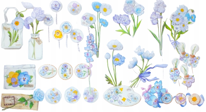 A254 NAKLEJKI SCRAPBOOKING FOLIOWE 20X KWIATY, BŁĘKITY GLAMOUR