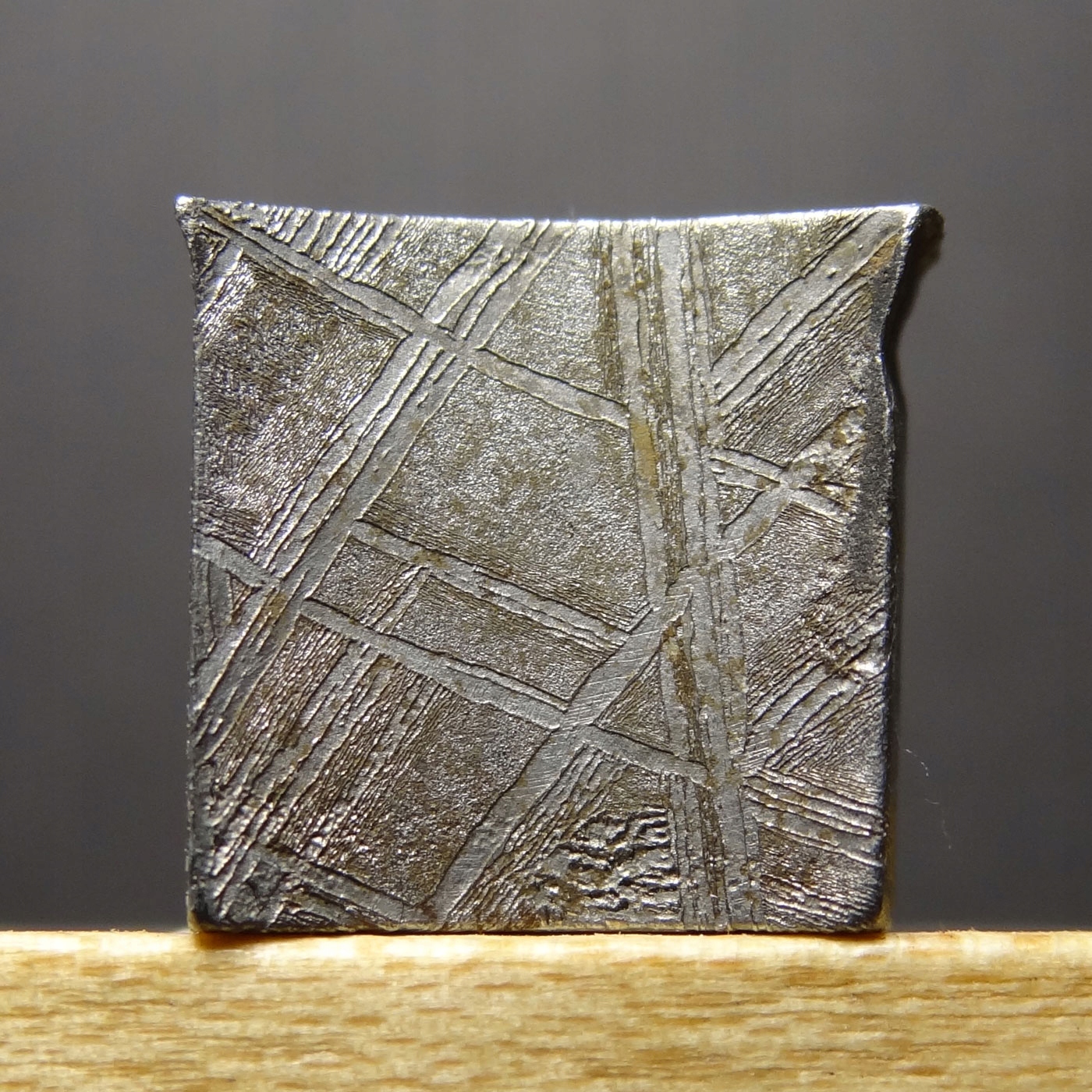 Разрезанный фрагмент метеорита. Очень хорошо видны фигуры Видманштеттена (характерный узор из параллельных ламелей камасита и тэнита).