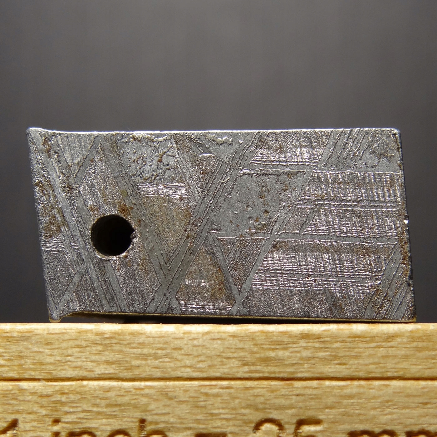 Разрезанный фрагмент метеорита. Очень хорошо видны фигуры Видманштеттена (характерный узор из параллельных ламелей камасита и тэнита).