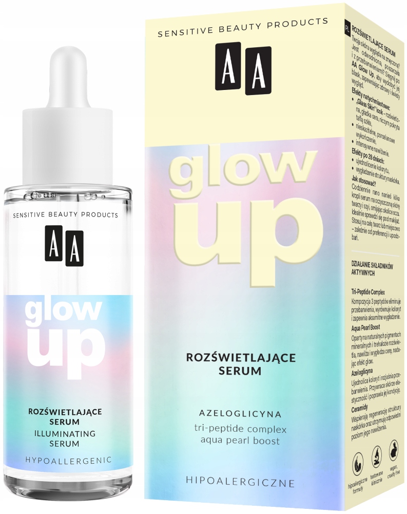 Воспользуйтесь средством AA Glow Up, чтобы подчеркнуть его сияние и придать коже здоровый и свежий вид. Осветляющая сыворотка с комплексом из 3-х пептидов, керамидов и азелоглицина мгновенно придаст вашей коже вид «Стеклянной кожи» — безупречный фарфоровый финиш и интенсивное увлажнение, а уже через 28 дней структура эпидермиса станет единой, а цвет — более ровным. быть четным.