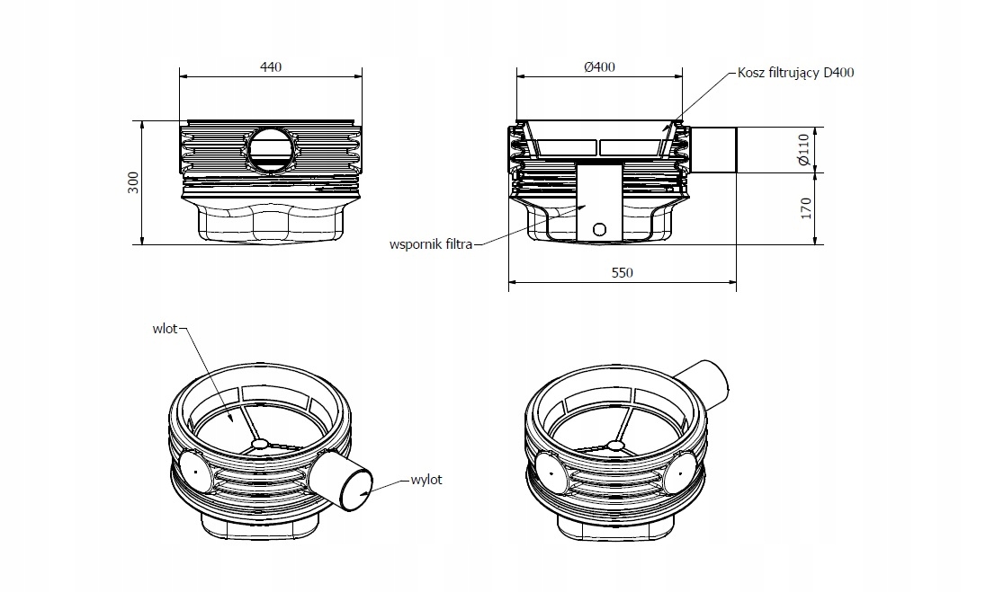 Предназначен для установки перед бетонными или пластиковыми резервуарами. Фильтр на основе сборной чаши с выходным отверстием Ø110. Дополнительная опора под корзиной фильтра для предотвращения случайного повреждения. Корзина фильтра, размеры которой позволяют очищать дождевую воду с поверхности крыши площадью до 200 м2.