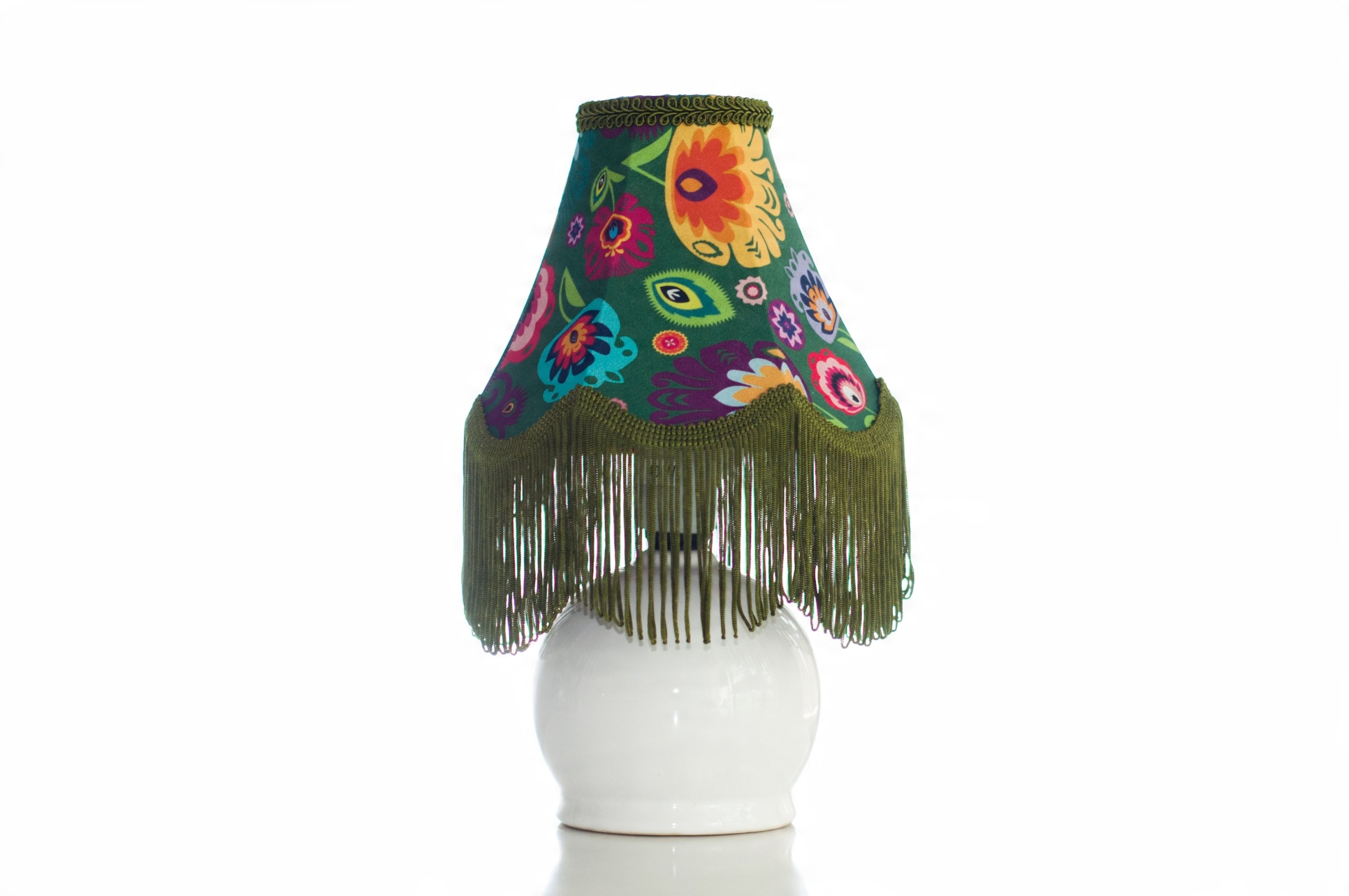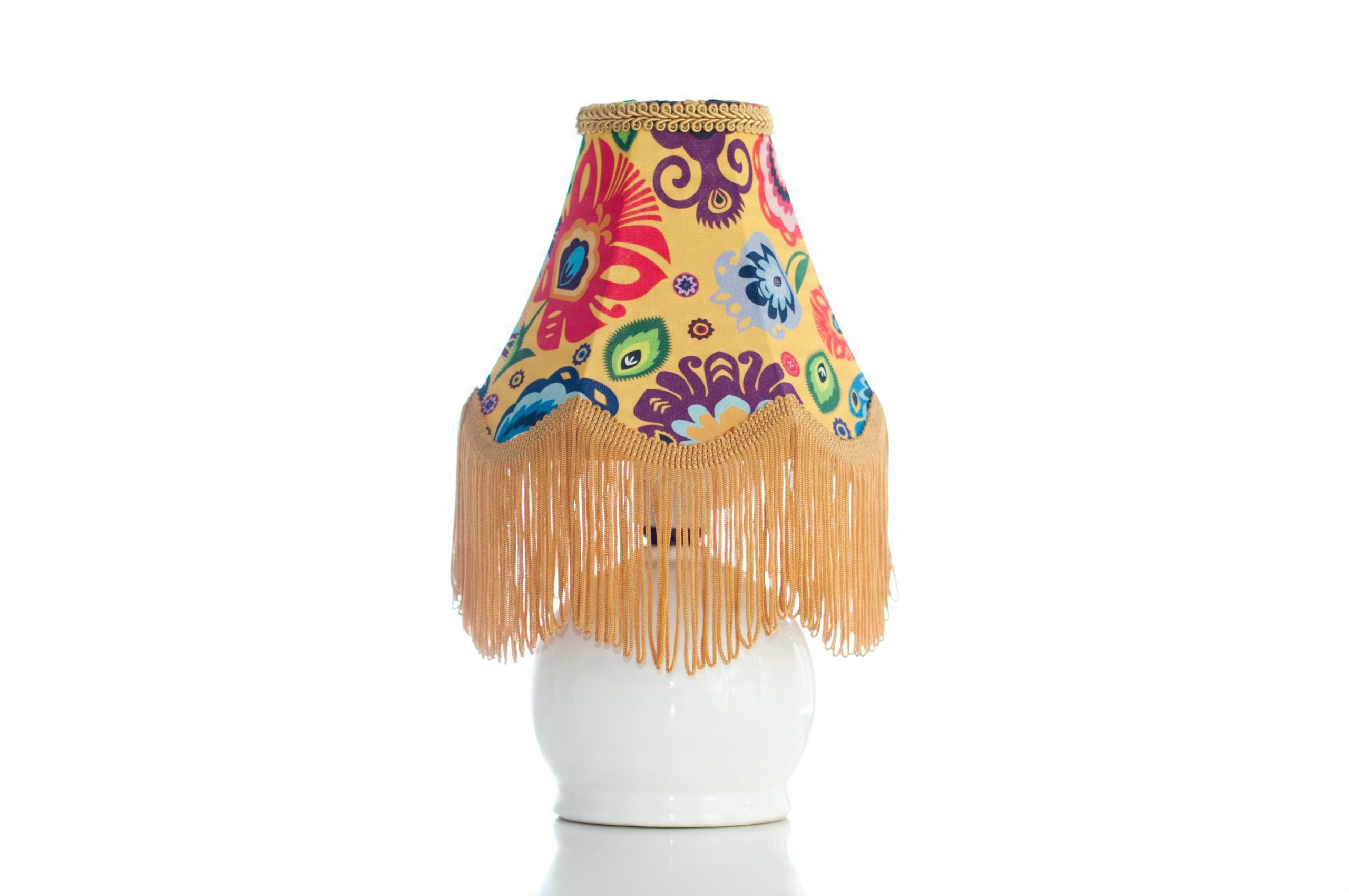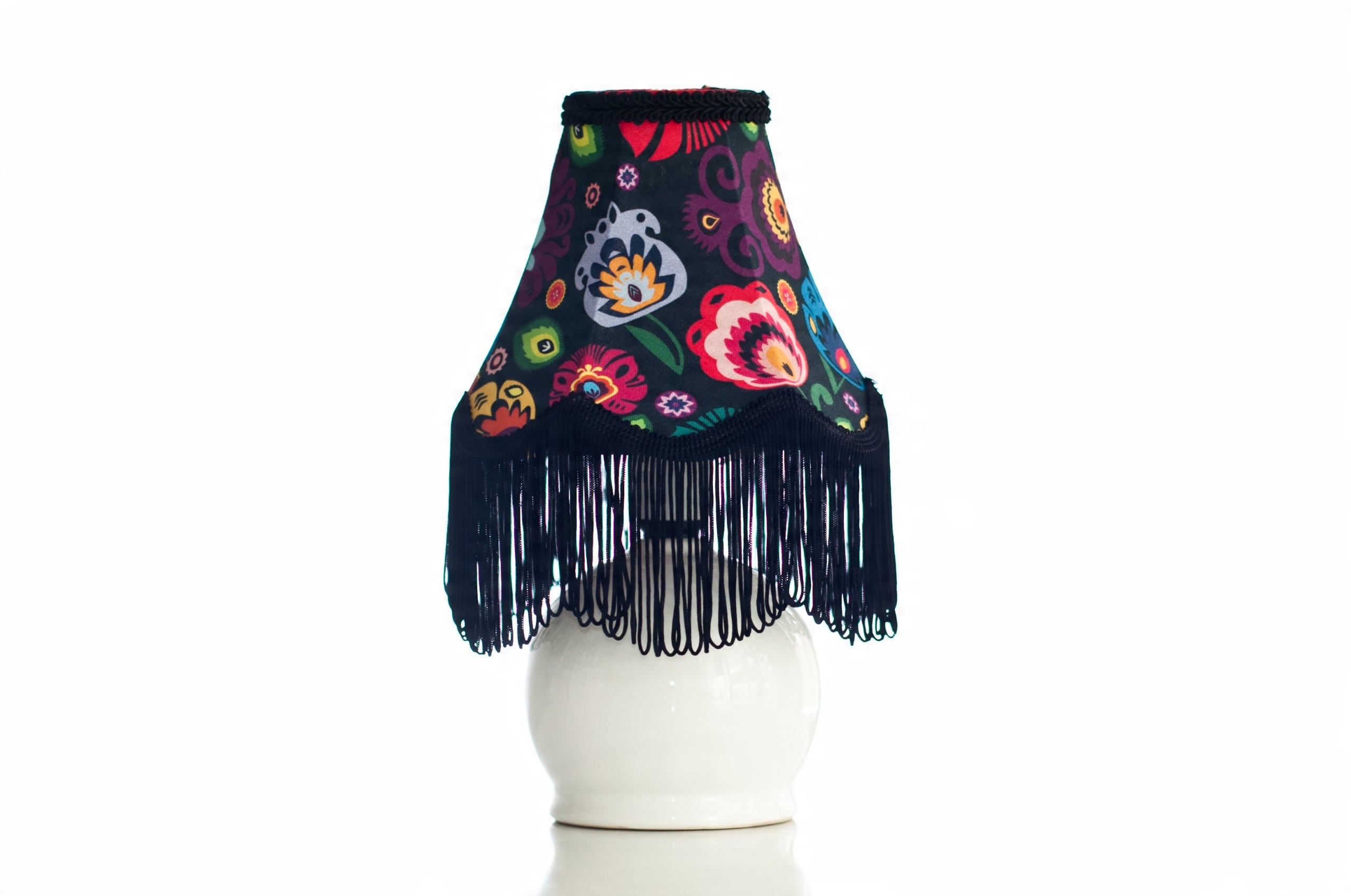 Ловичский стиль включает в себя народные мотивы, восхищающие богатством красок. Абажуры из этой коллекции украшены красивой галантерейной фурнитурой в виде лент и длинной бахромы.