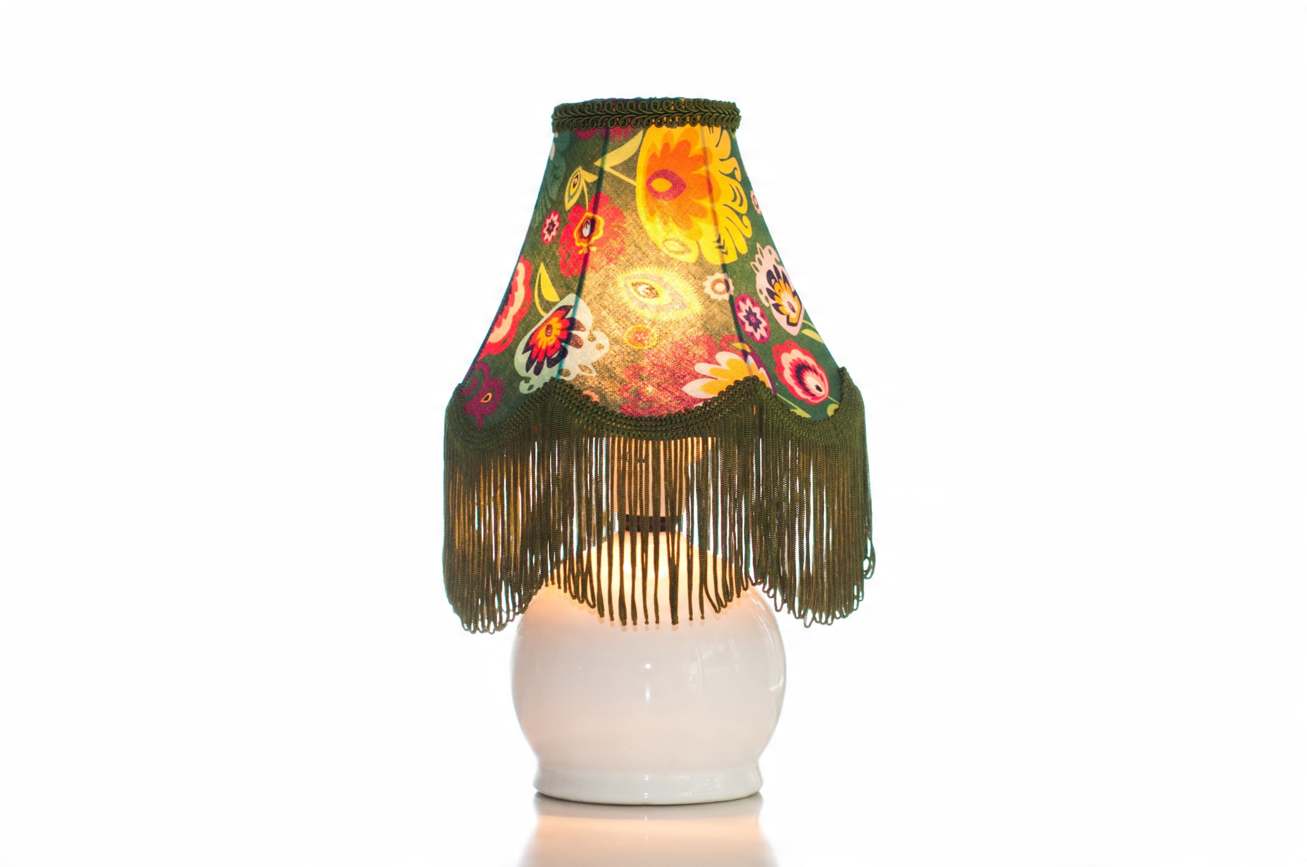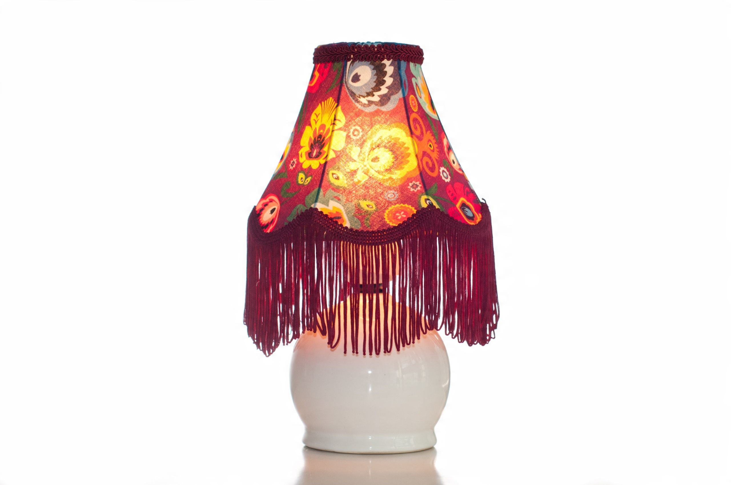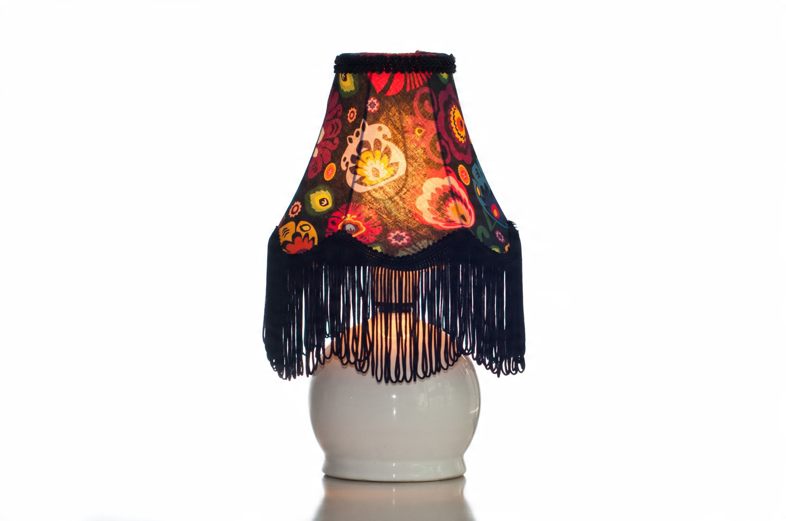 Ловичский стиль включает в себя народные мотивы, восхищающие богатством красок. Абажуры из этой коллекции украшены красивой галантерейной фурнитурой в виде лент и длинной бахромы.