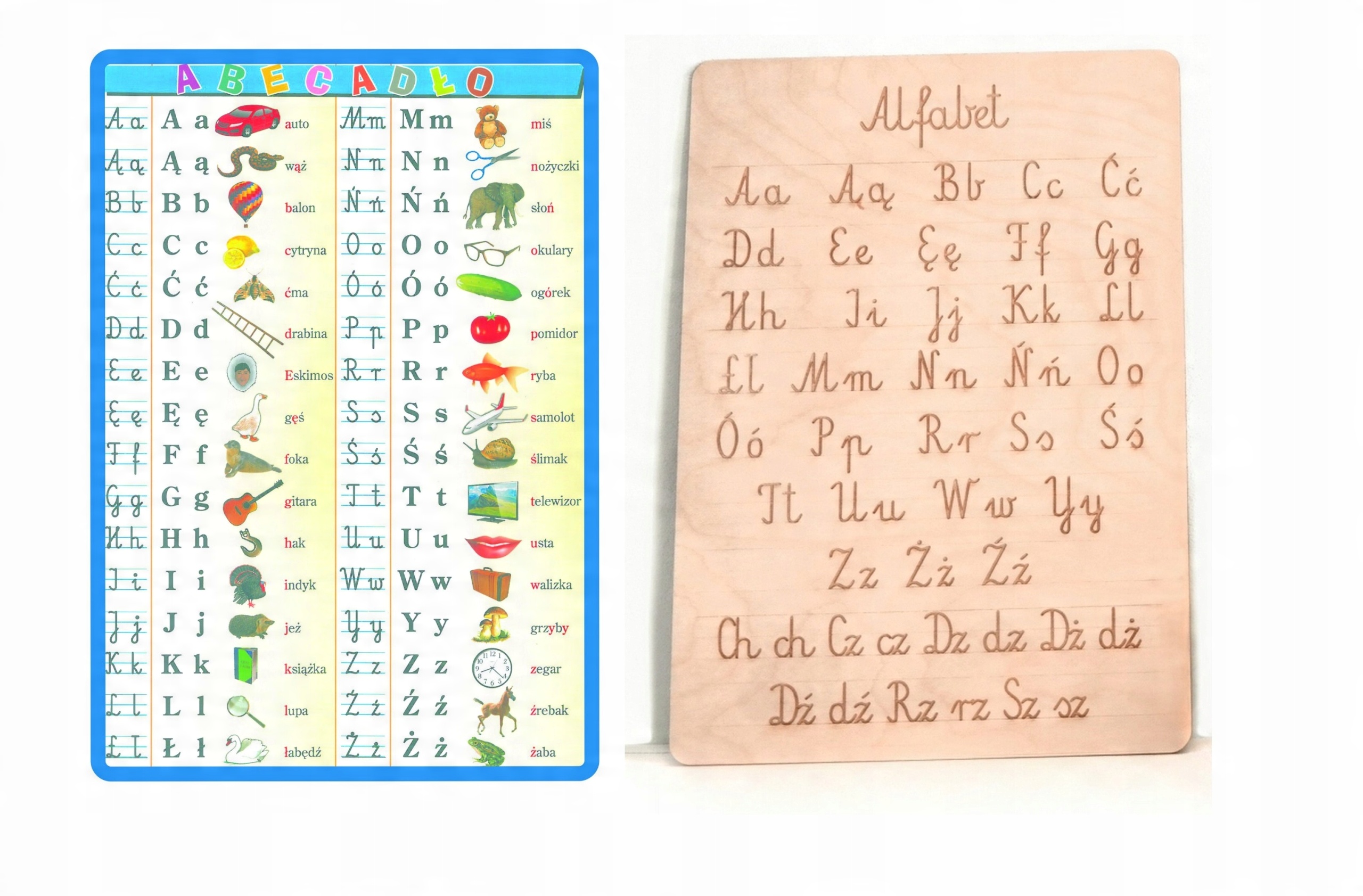 ABECADŁO ALFABET LAMINOWANY A4 +Drewniany Alfabet pisany MONTESSORI