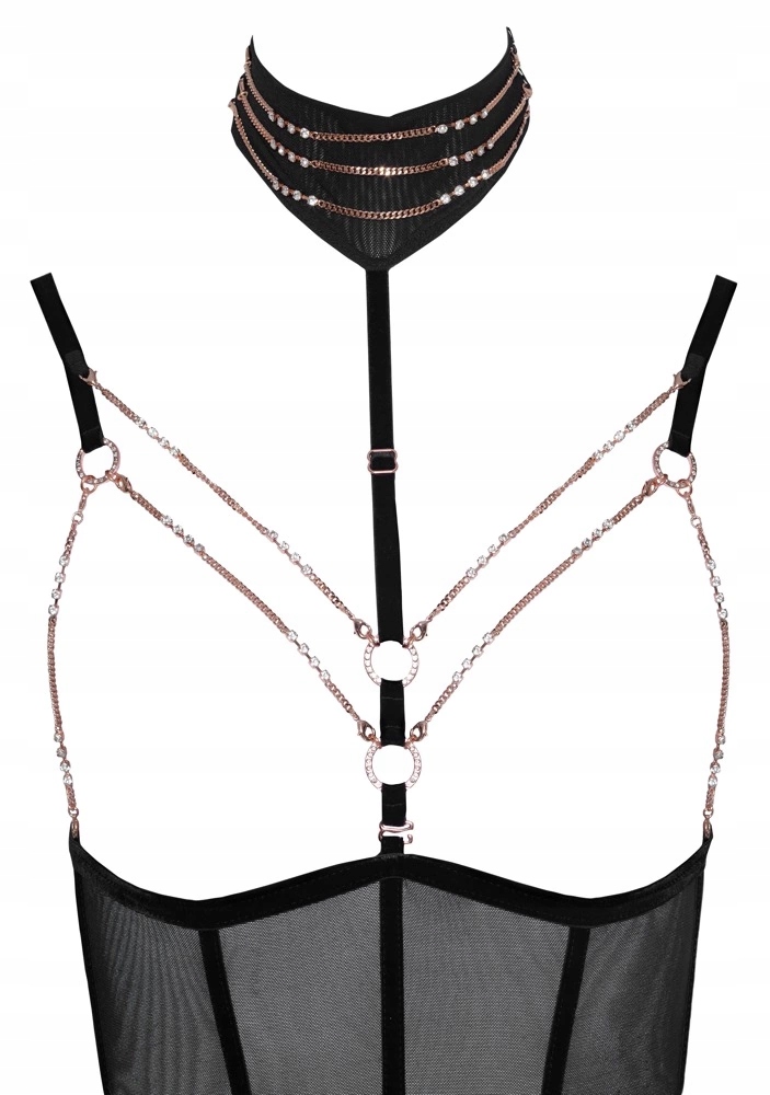 Регулируемый ремешок на шее с ожерельем-цепочкой (с застежкой на пуговицы) также является съемным. как и цепочки на груди с небольшими карабинами и цепочка в промежности с декоративным кольцом.