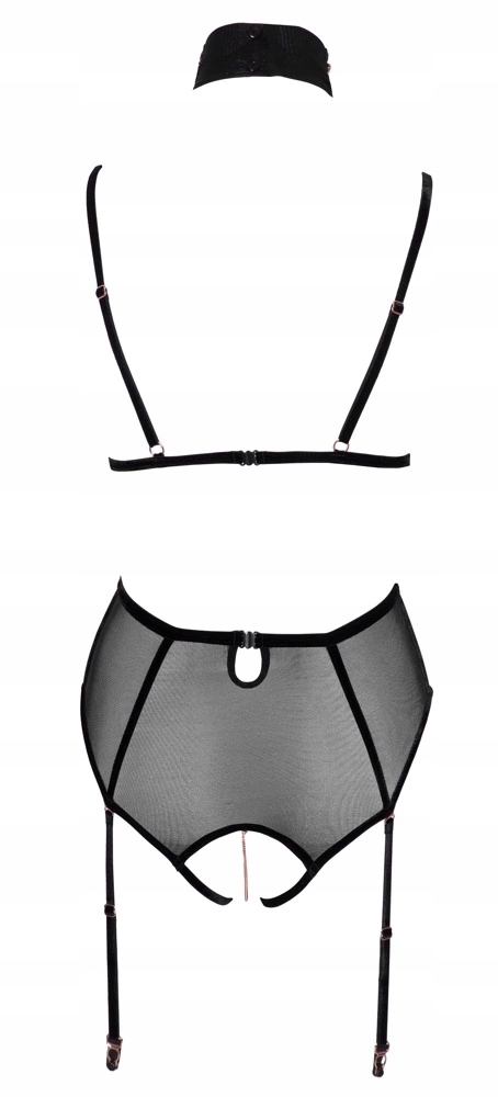 Стильно и привлекательно инновационно! Боди без груди Abierta Fina с полностью открытой промежностью из Powernet, с эластичными бархатными бретелями и элементами украшений из розового золота. Регулируемые бретели и подтяжки, в том числе съемные.