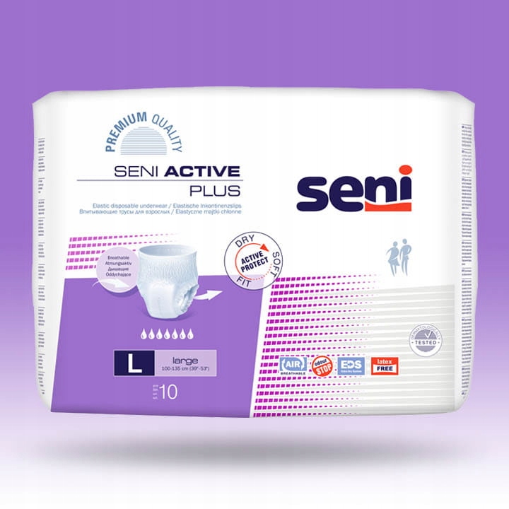 Это последний из трех уровней впитываемости впитывающих трусиков Seni Active. Впитывающие трусики Seni Active Plus рекомендуются людям, у которых очень сильно выделяется моча, а также тем, кто не пользуется туалетом или пользуется им редко.