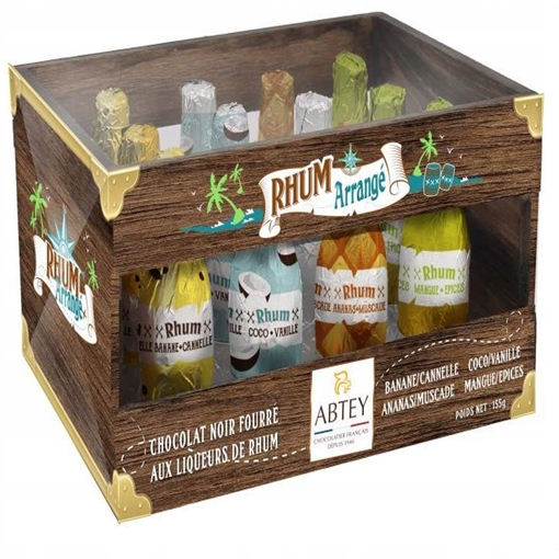 ABTEY Rhum Arrange бутылки шоколадного рома 155г: Коктейли на основе рома, с фруктовыми и слегка пряными нотками, предлагаются в оболочке из темного шоколада, без кристаллизации сахара.Это восхитительное сочетание темного шоколада и рома - банан-корица, кокос-ваниль, ананас-мускат, специи манго-чай.