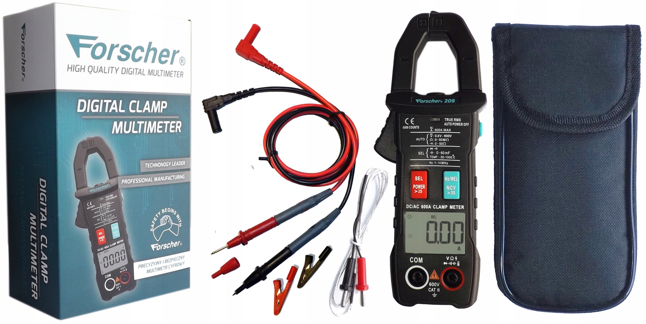 В комплект входят: клещи Forscher FS209, чехол с зажимом для ремня, силиконовые измерительные провода (набор), зажимы типа «крокодил» (набор), датчик температуры, батарейки в комплекте.
