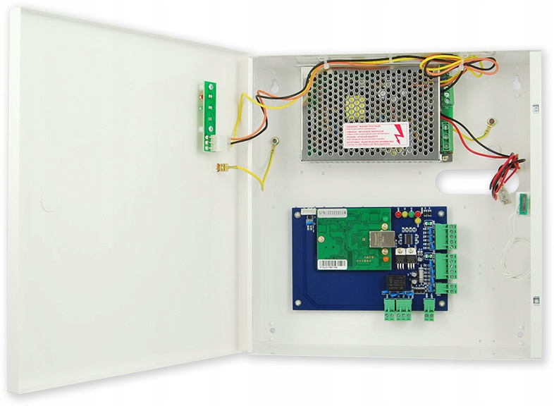Блок управления (в жестяной коробке с источником питания 3 а) Доступ для одной двери. Блок управления имеет один выходной реле для управления блокировкой, можно подключить 2 читателя с выходом Wiegand 26 битов для управления одной дверью с обеих сторон. Читатели могут быть подключены с максимального расстояния 100 м. Блок управления оценивает переходы на читателях, пользовательское программное обеспечение в Чехии для управления системой управления доступом доступно. Программное обеспечение бесплатно и позволяет управлять контрольными единицами (до 128 читателей). SW и подразделения общаются через локальную сеть.