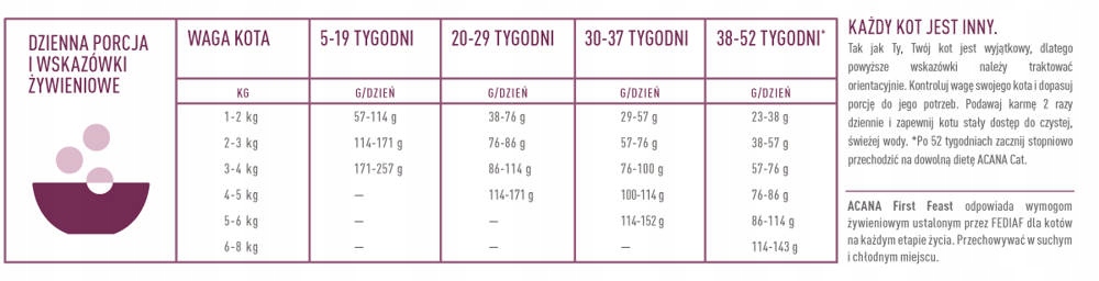 С ПТИЦЕЙ, СЕЛЬДЬЮ И ЯЙЦАМИ Начните жизнь вашего котенка с еды, полной ингредиентов животного происхождения. Корм ACANA First Feast создан для того, чтобы обеспечить котят всем необходимым для правильного роста и развития. Формула наполнена курицей и цельной селедкой в пропорциях WholePrey: мясо, органы, хрящи и кости. Благодаря этому он обеспечивает котят всем, что важно для их здоровья и счастья. Он также имеет чрезвычайно восхитительный вкус, который понравится вашему котенку.