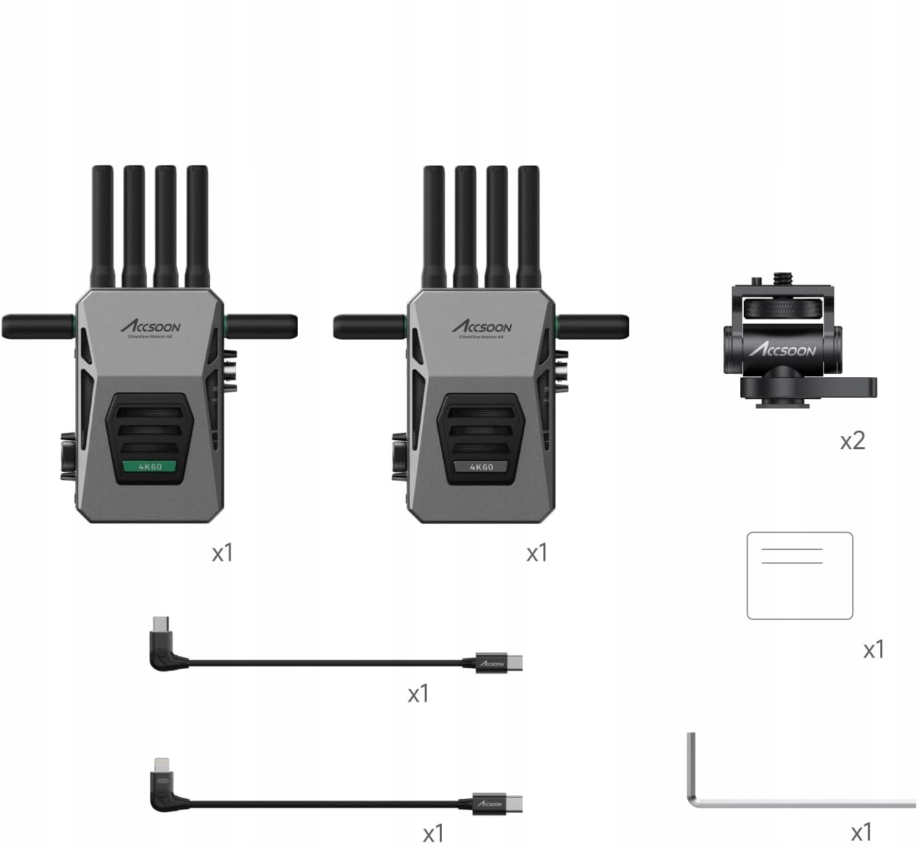 Передатчик CineView Master 4K, приемник CineView Master 4K, кабель USB-C и кабель освещения, шестигранный ключ и два адаптера для холодной обуви.