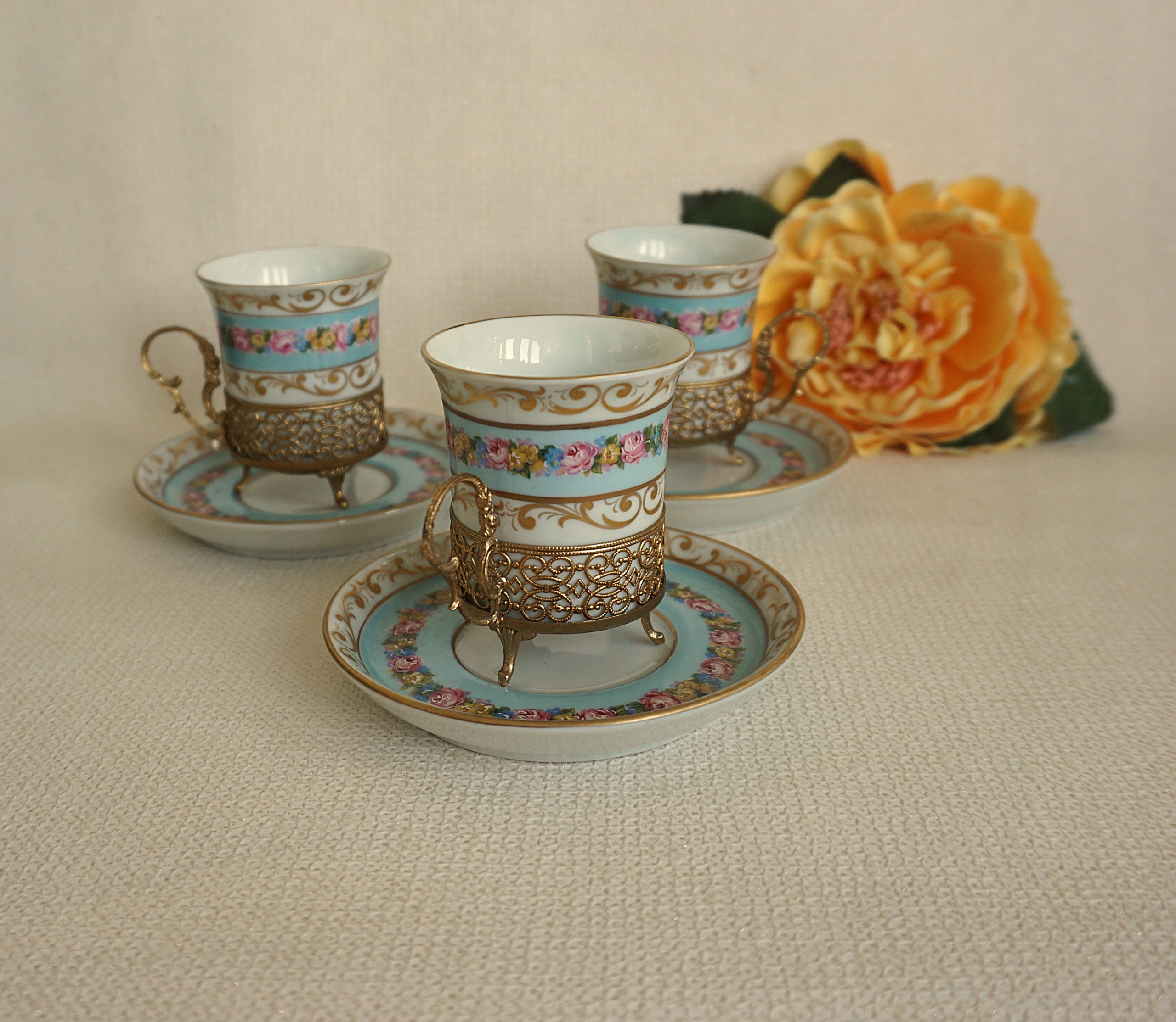 Цвет фарфора: белый. На поверхности расписаны вручную цветочные орнаменты: розы и чудесная, изысканная позолота. На блюдце выбито клеймо производителя. Чашка заключена в искусную латунную корзину. Удалить невозможно.