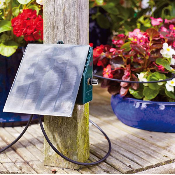Интеллектуальная система орошения, использующая солнечную энергию. В зависимости от погоды контроллер меняет частоту полива, обеспечивая оптимальное увлажнение растения.