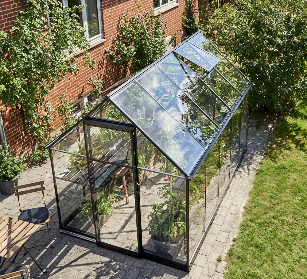 теплицы изготовлены полностью из алюминия, заполненного закаленным стеклом толщиной 3 мм. Интегрированные желоба и без усилий, открывающие раздвижные двери являются стандартными. Нажмите на 2 окна на крыше позволяют непрерывную замену воздуха.
