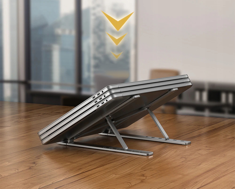 Подставка складная, поэтому в сложенном виде имеет очень маленькие габариты. Он поместится в любой ящик стола или сумку для ноутбука.
