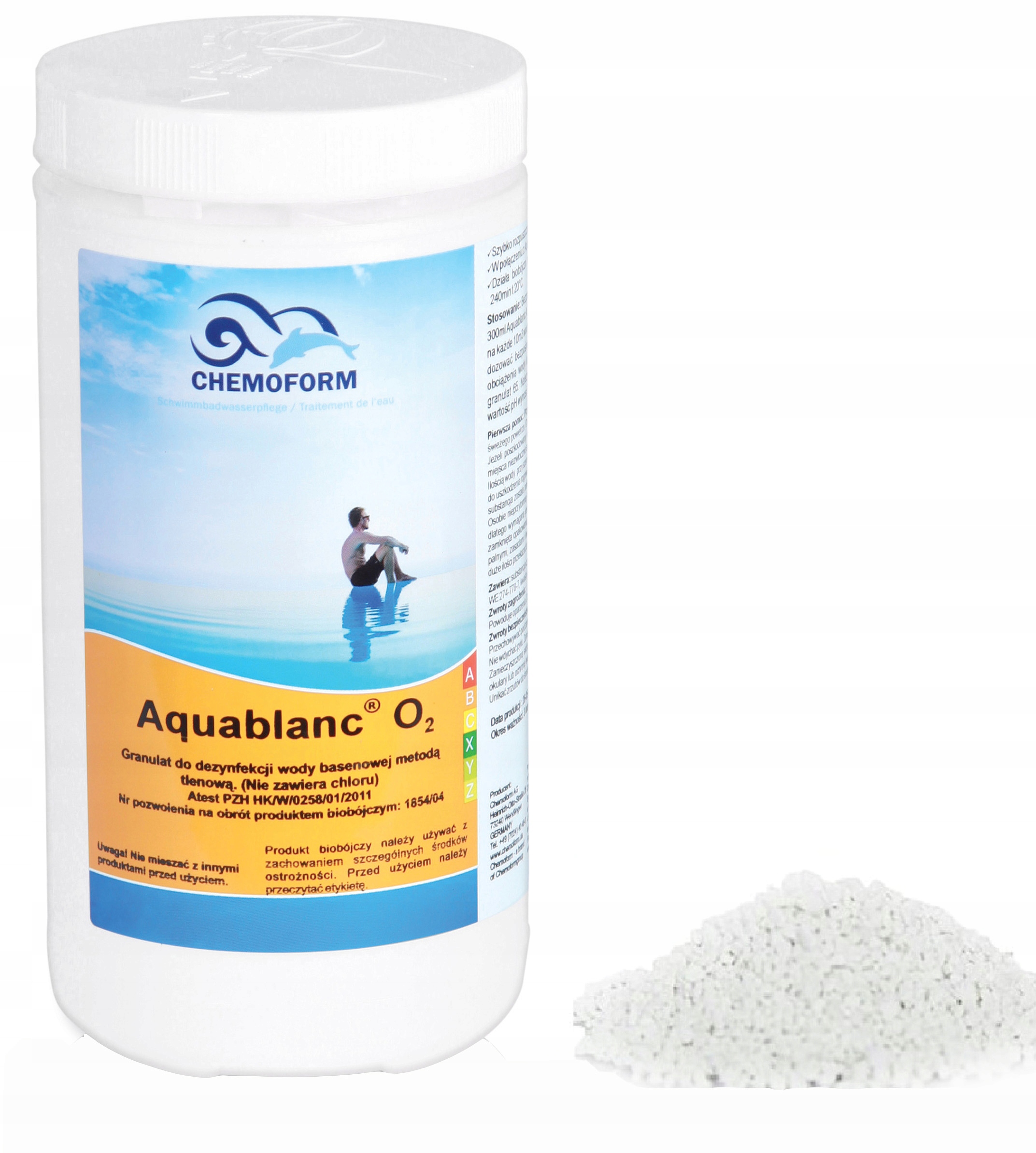 Гранулы активного кислорода для бесхлорной дезинфекции воды в частных бассейнах. Используйте вместе с Aquablanc A (синергический эффект).