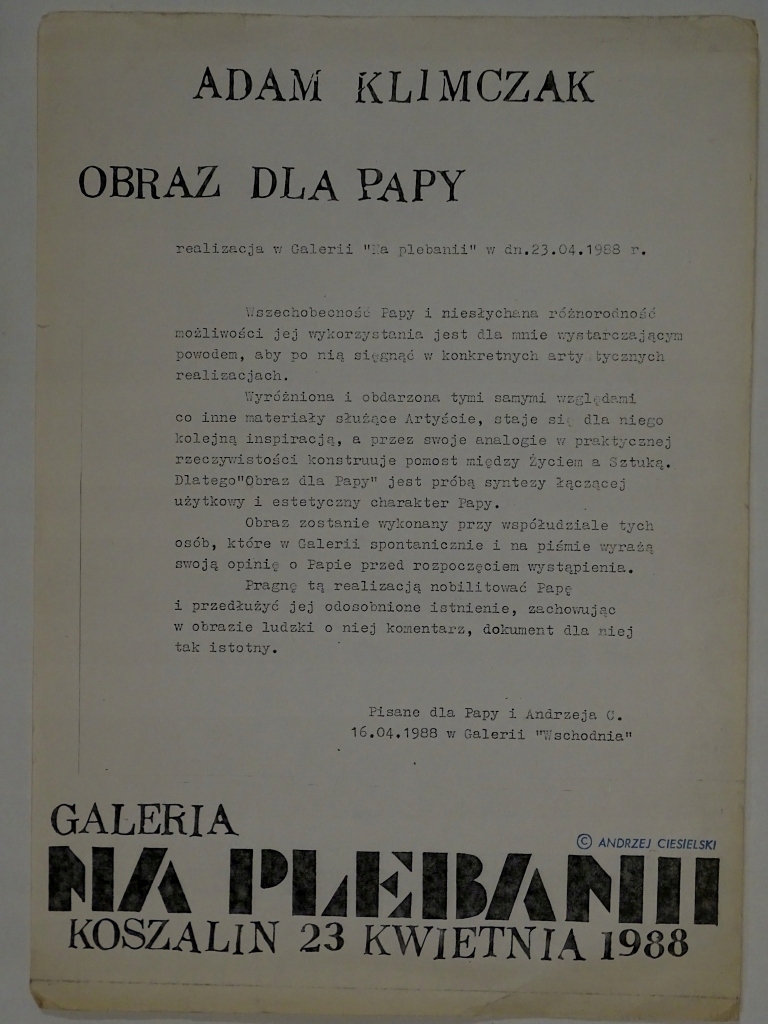 ПРОДАЖАЕМ ВЫСТАВКУ В УСЛОВИЯХ ГАЛЕРЕЯ "НА ПРЕДВИДЕНИИ" в КОШАЛИНЕ 23 АПРЕЛЯ 1988 ГОДА