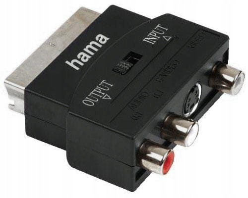 Двунаправленныйаудио/видео адаптер EURO SCART, штекер (вилка) <- 3x RCA + S-Video. Направление сигнала выбирается вручную переключателем.