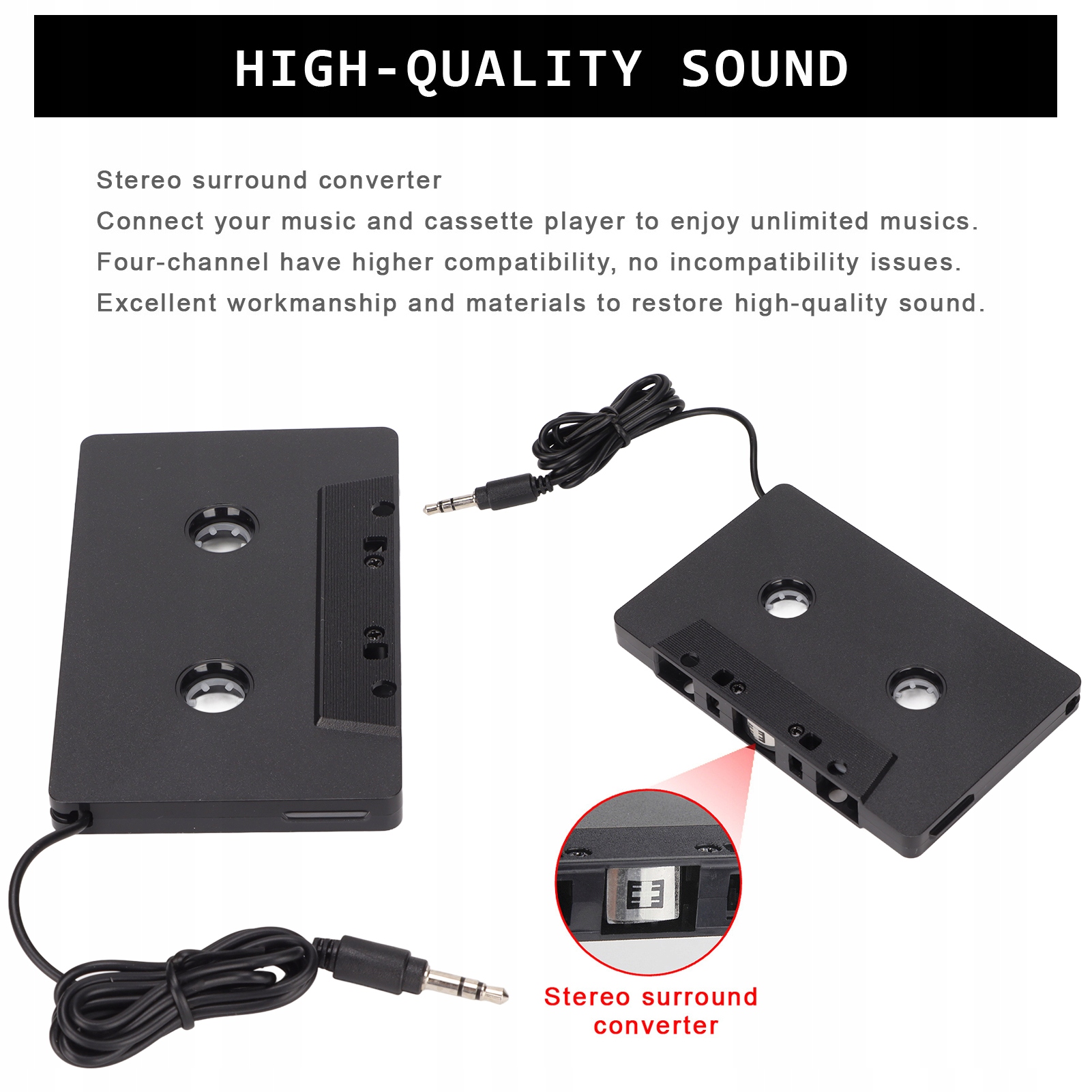 4. Основная функция: четырехканальный преобразователь ленты, конвертирующий другую музыку в форматы MP3, MP4, CD, MD, ПК, мобильный телефон и т. д. в ленточный проигрыватель через вспомогательный адаптер ленты 3,5 мм.