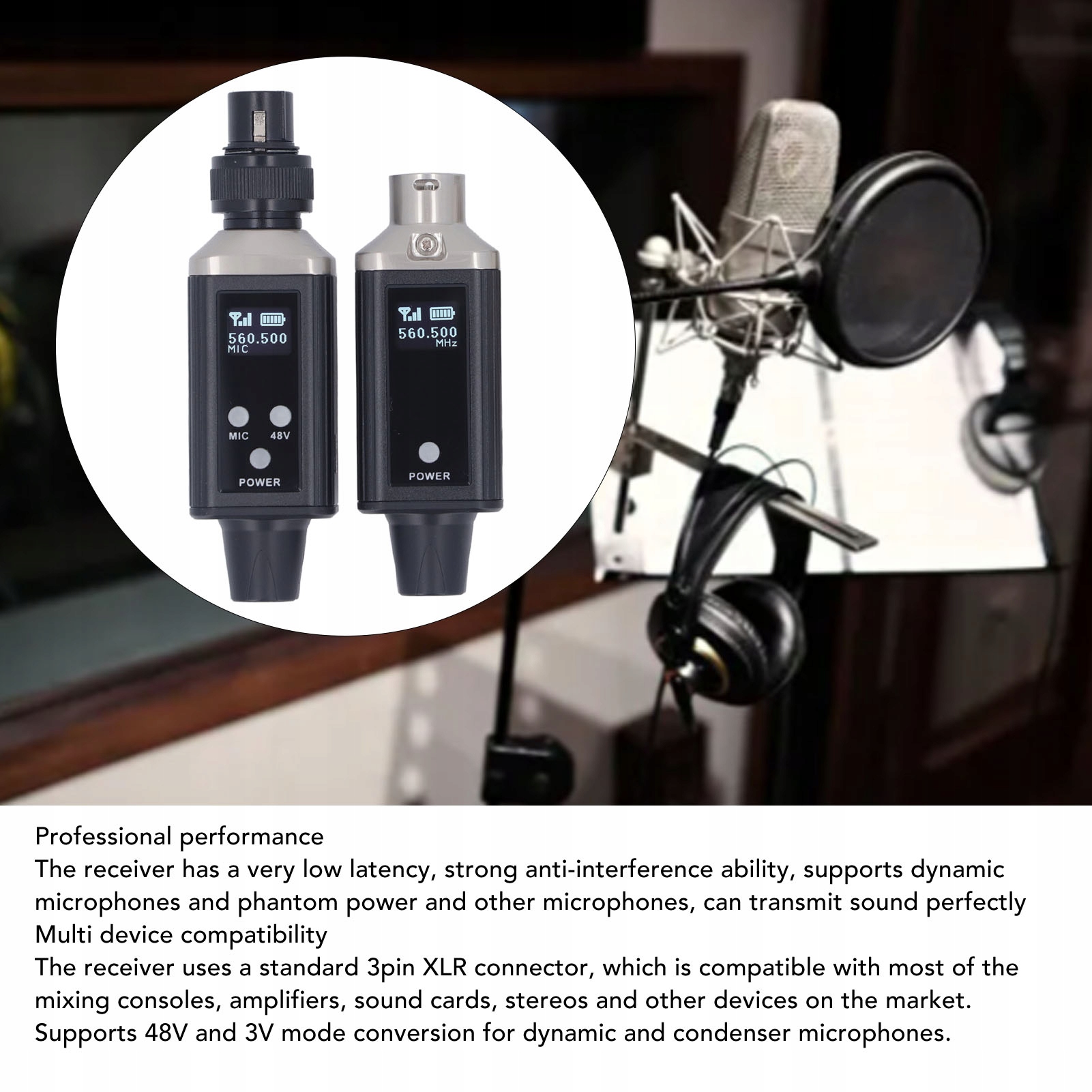 4. Совместимость с несколькими устройствами: в ресивере используется стандартный 3-контактный разъем XLR, который совместим с большинством микшерных консолей, усилителей, звуковых карт, стереосистем и других устройств, представленных на рынке, и поддерживает преобразование режимов 48 В и 3 В для подключения динамических и конденсаторных микрофонов.