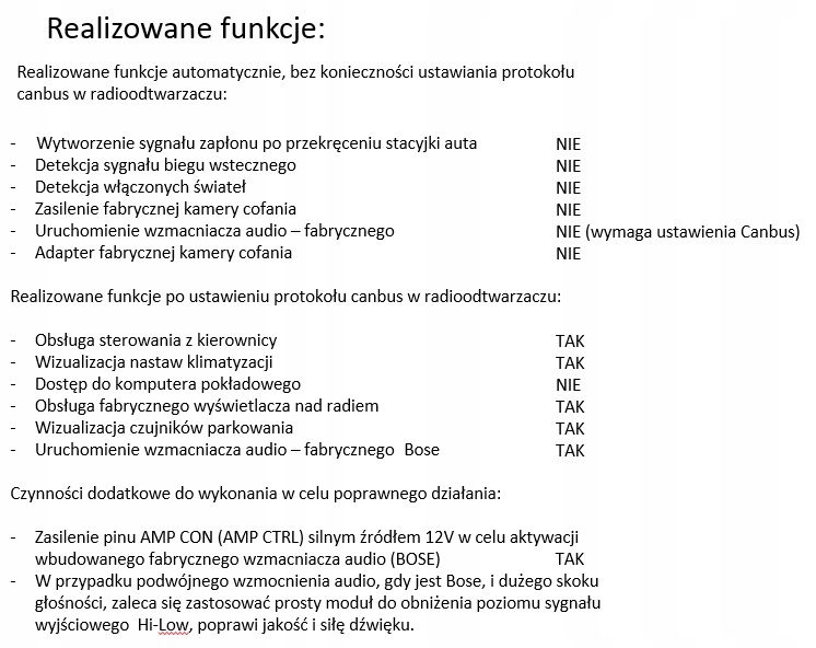 Модуль позволяет вам запускать систему Bose в автомобильных моделях, как указано выше. Подходит для каждого заменного радио. Если у вас есть немного другой плагин в вашем замене радио, вы можете выдвигать булавки в соответствии со схемой выше. Все, что вам нужно сделать, это подключить адаптер и пополнить контактный контакт AMP на любой 12 В. Если в вашем радио входы TX RX вы можете дополнительно начать связь с верхним дисплеем (отчет о библиотеке CAN на радио -радио -мазах также необходимо для чтения сигналов. На обычном радио он будет просто работать. Наш луч также поддерживает контрольные сигналы с руля, если ваше радио поддерживает их - вы должны подключить K1 или k2 к вашему радио.