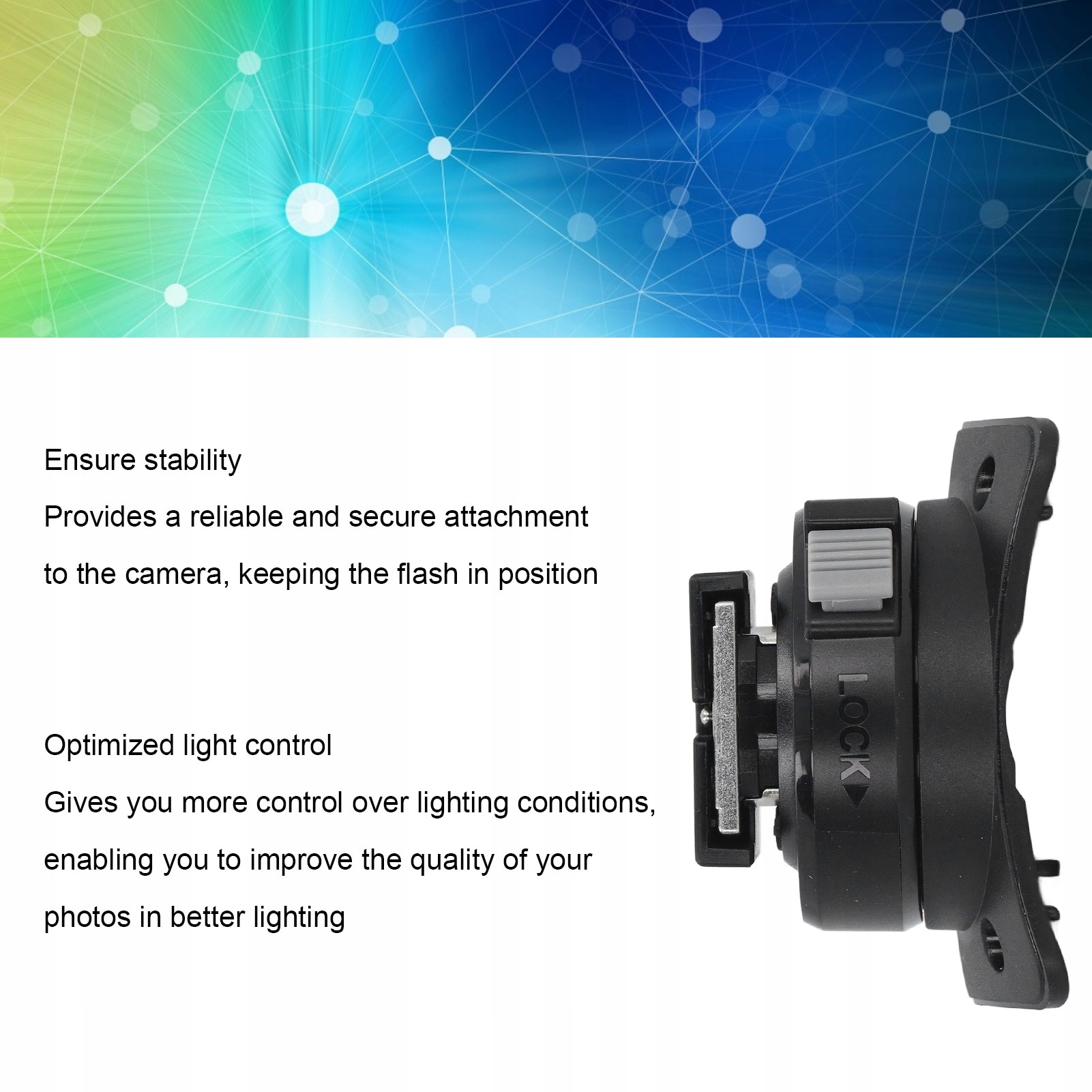 3. Безопасное крепление: база обеспечивает надежное и безопасное крепление камеры, сохраняя вспышку на месте и гарантируя, что она не упадет при фотографировании.