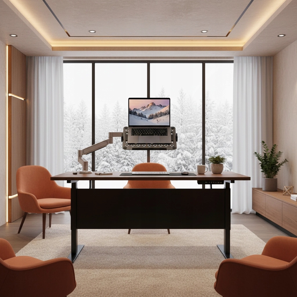Крепление ноутбука на руке позволяет идеально расположить экран на уровне глаз, поддерживая правильную осанку и снижая напряжение в шейном отделе позвоночника и утомляемость глаз. Благодаря этому ноутбук работает как полноценный второй экран, равный основному монитору, что улучшает многозадачность и действительно повышает комфортность выполнения повседневных обязанностей.